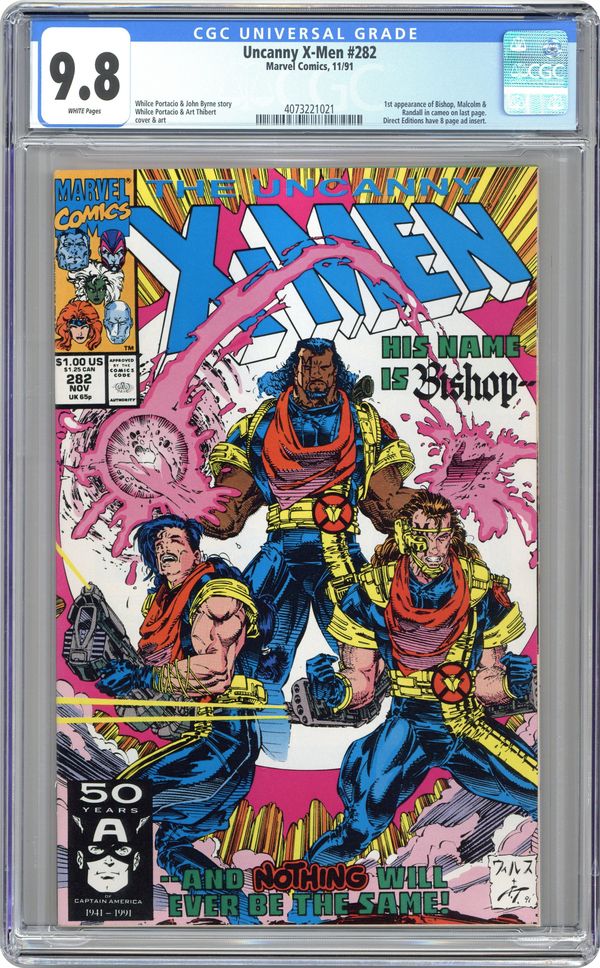 Direct Edition. "Payback!" Story by Whilce Portacio and John Byrne. Art by Whilce Portacio and Art Thibert. In one fell swoop the Upstarts have destroyed the Reavers and crippled the Hellfire Club. Next up, the Mutant Liberation Front. Who can stop these powerful new foes? Enter: Bishop! NOTE: 1st appearance of Bishop. 40 pgs. Cover price $1.00. Grade: CGC 9.8 explanation of grade Condition: Used (collectible)