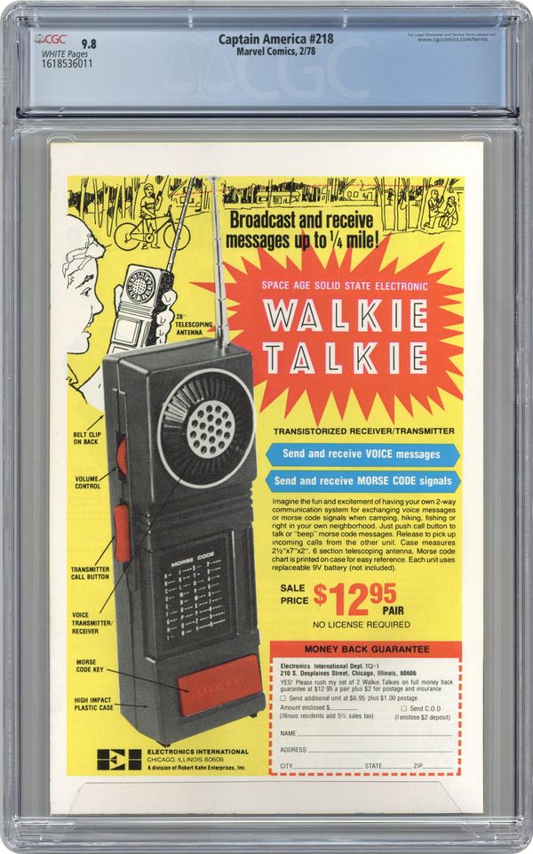 "One Day in Newfoundland" Guest-starring Iron Man. Script by Don Glut. Art by Sal Buscema (breakdowns), Mike Esposito (finishes), and John Tartaglione (finishes). Cover by Sal Buscema and Joe Sinnott. After meeting the mysterious Veda on the street outside his apartment, Captain America takes her to Avengers Mansion to talk. However, while at the mansion, Cap and Shell-Head strike up a conversation about the Avengers' submarine -- that pulled the Living Legend from the icy waters of the North Sea (in the classic Avengers #4). And after listening to the sub's old audio tapes, Cap discovers an inconsistency in his origin! Why did he mention striking the water off the coast of Newfoundland, Canada, when he actually fell into the English Channel? To answer that question, the star-spangled avenger returns to Newfoundland...where the mystery only deepens! First (cameo) appearances of Lyle Dekker and the Ameridroid. Cameo appearances by the Falcon, Sharon Carter, Nick Fury, Jarvis, Marvel Man (aka Wendell Vaughn), Blue Streak, Texas Twister, and the Vamp. 36 pages. Cover price $0.35. Grade: CGC 9.8 explanation of grade Condition: Used (collectible)