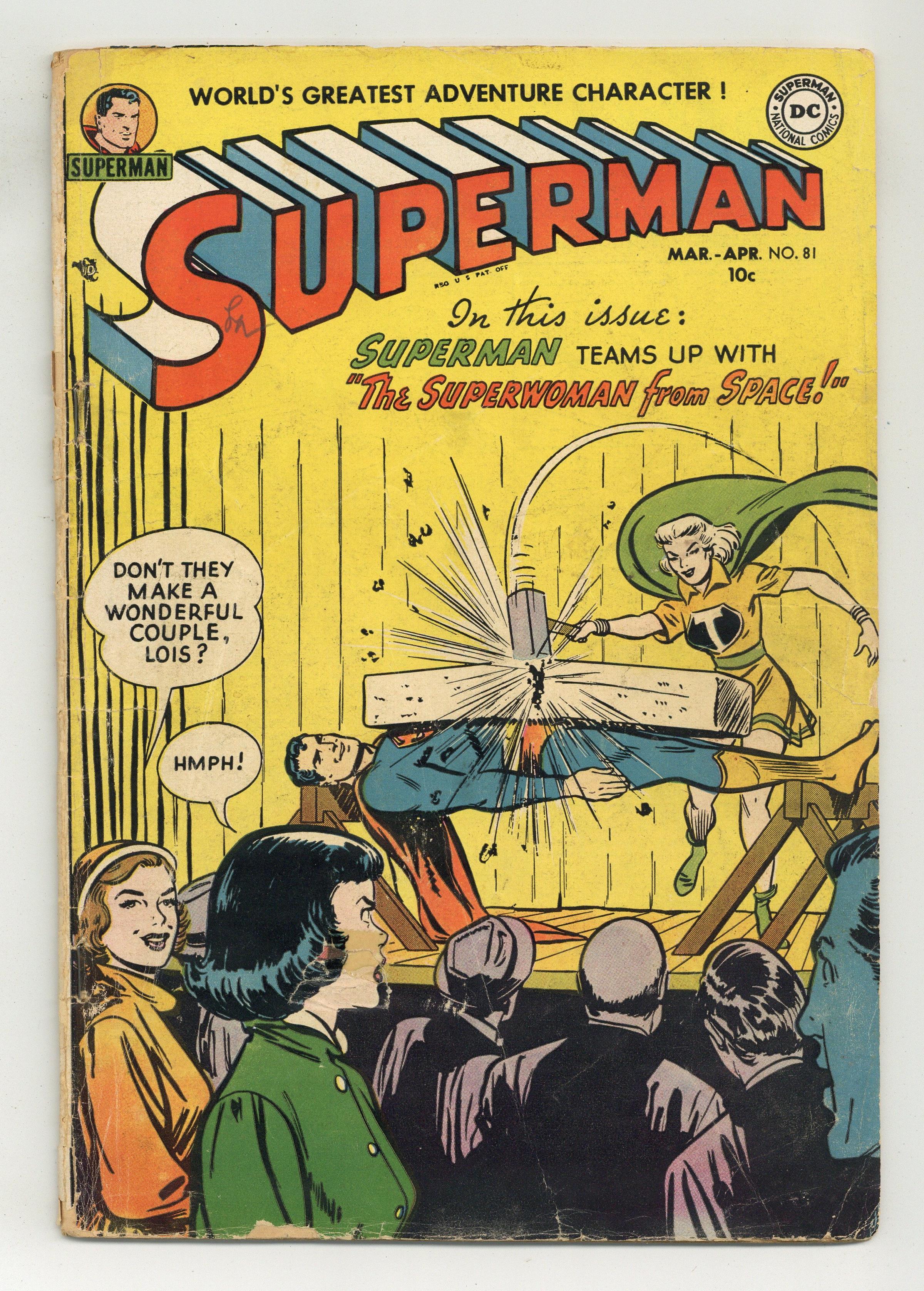 Cover art by Win Mortimer. Superman's Secret Workshop starring Superman and Lex Luthor, script by Edmond Hamilton, pencils by Wayne Boring, inks by Stan Kaye. Twenty Thousand Leagues Under the Sea With Superman starring Superman and Little Dan Wheeler, script by Bill Finger, art by Al Plastino. Mysterious Moving Islands text story by Capt. Jeb Manton. The Superwoman From Space starring Superman, Tharka (Intro, the Superwoman), and Bowtie Barris, script by Bill Woolfolk, art by Al Plastino. 44 Pages, Full Color. Cover price $0.10. Grade: GD- 1.8 explanation of grade Condition: Used (collectible)