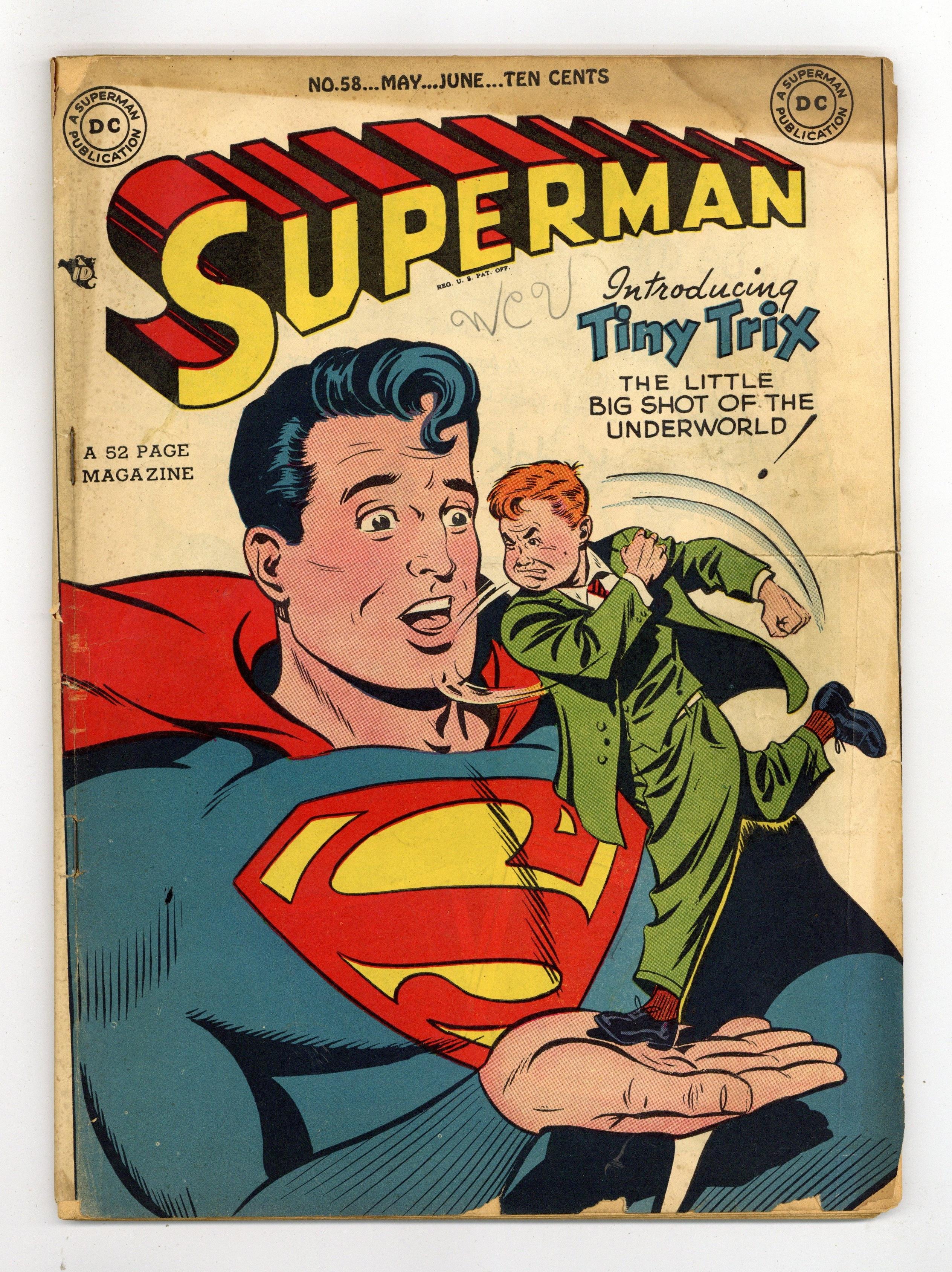 Cover art by Al Plastino. Tiny Trix, the Bantam Bandit, script by William Woolfolk, art by Al Plastino; Tiny Trix tries to get out of jail by claiming he's a juvenile. Lois Lane Loves Clark Kent, script by William Woolfolk, pencils by Wayne Boring, inks by Stan Kaye; Lois' doctor advises her to try to transfer her love for Superman to a normal human, but her attempt to fall in love with Clark fails. Shorty humor two-pager by Henry Boltinoff. Casey the Cop humor page by Boltinoff. The Case of the Second Superman, pencils by Wayne Boring, inks by Stan Kaye; An earth scientist rockets his child to another planet where he grows up with super powers; He comes to Earth seeking Superman's help against the criminal scientist Bantor. 52 Pages, Full Color. Cover price $0.10. Grade: GD/VG 3.0 explanation of grade Condition: Used (collectible)