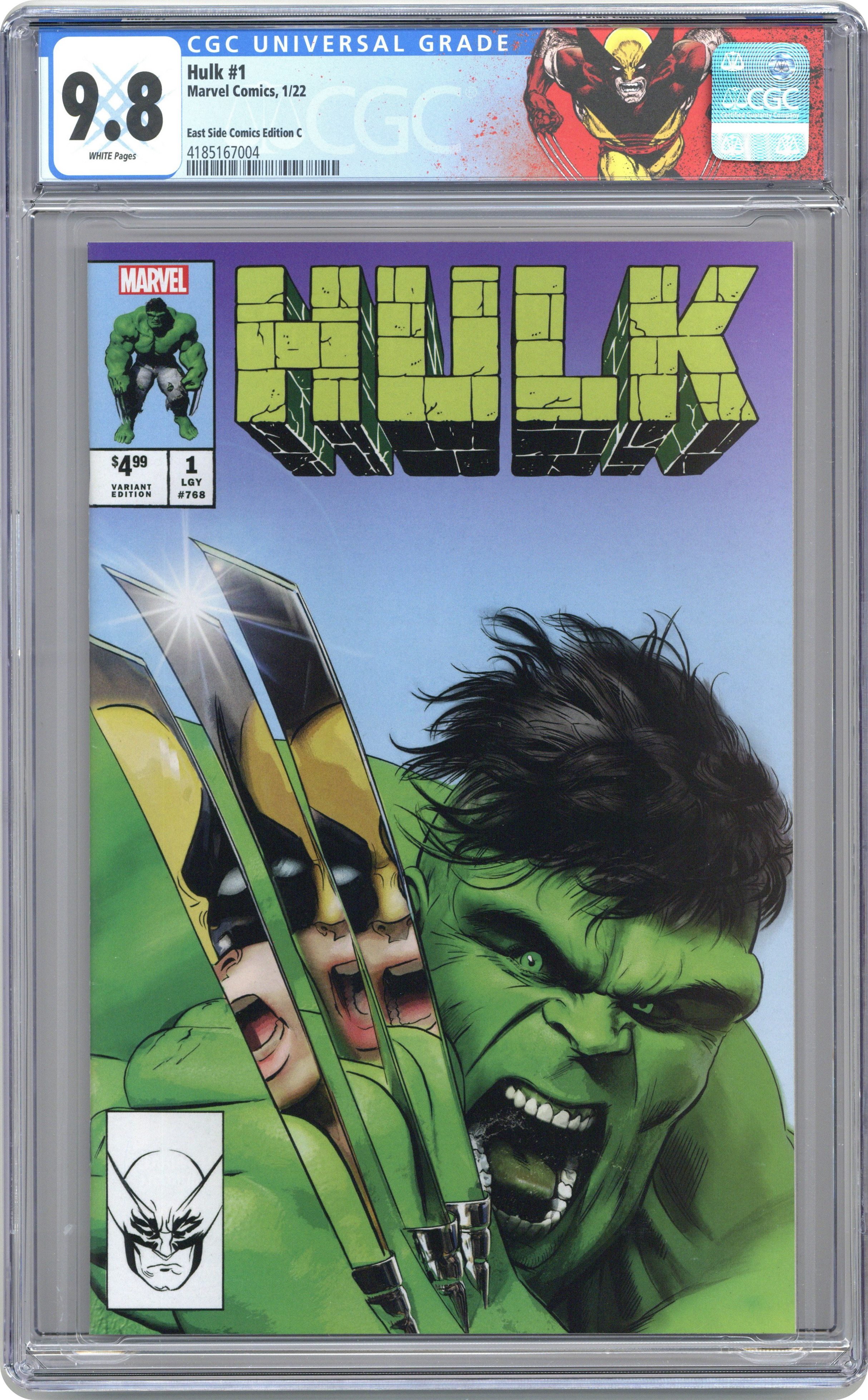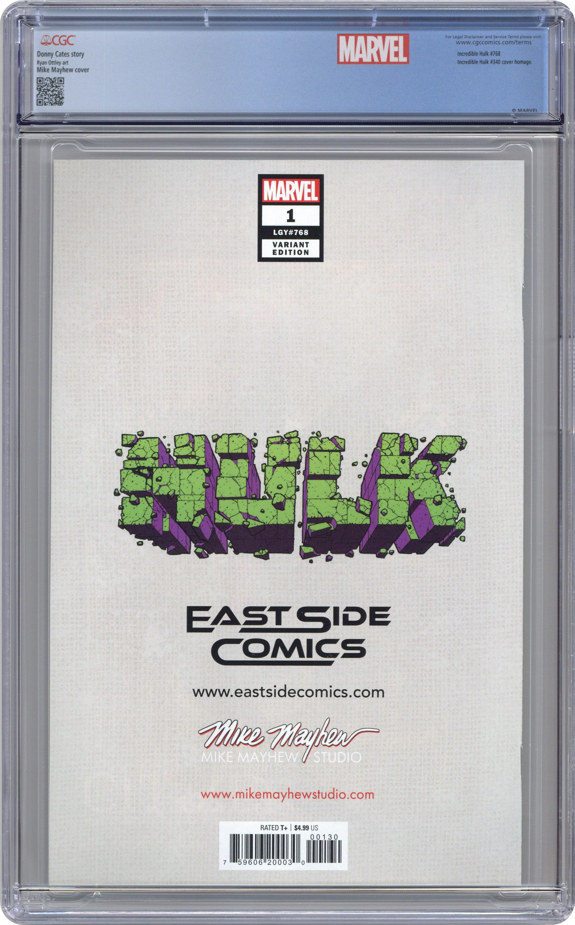 East Side Comics and Mike Mayhew Studios exclusive reverse homage cover by Mike Mayhew. Written by Donny Cates. Art by Ryan Ottley. IMMORTAL NO LONGER! CATES & OTTLEY DELIVER A NEW, COLOSSAL-SIZED ERA! MAD SCIENTIST Part 1 of 6 The uncontrollable rage of the Hulk has reached an all-new level, and nobody – including the Avengers – is prepared to handle it. But is it really the Hulk that people should be afraid of, or is there something missing to this puzzle? Join the superstar creative team of Donny Cates and Ryan Ottley as they look to the stars for the next era of HULK! 36 pages, full color. Rated T+ Grade: CGC 9.8 explanation of grade Condition: Used (collectible)