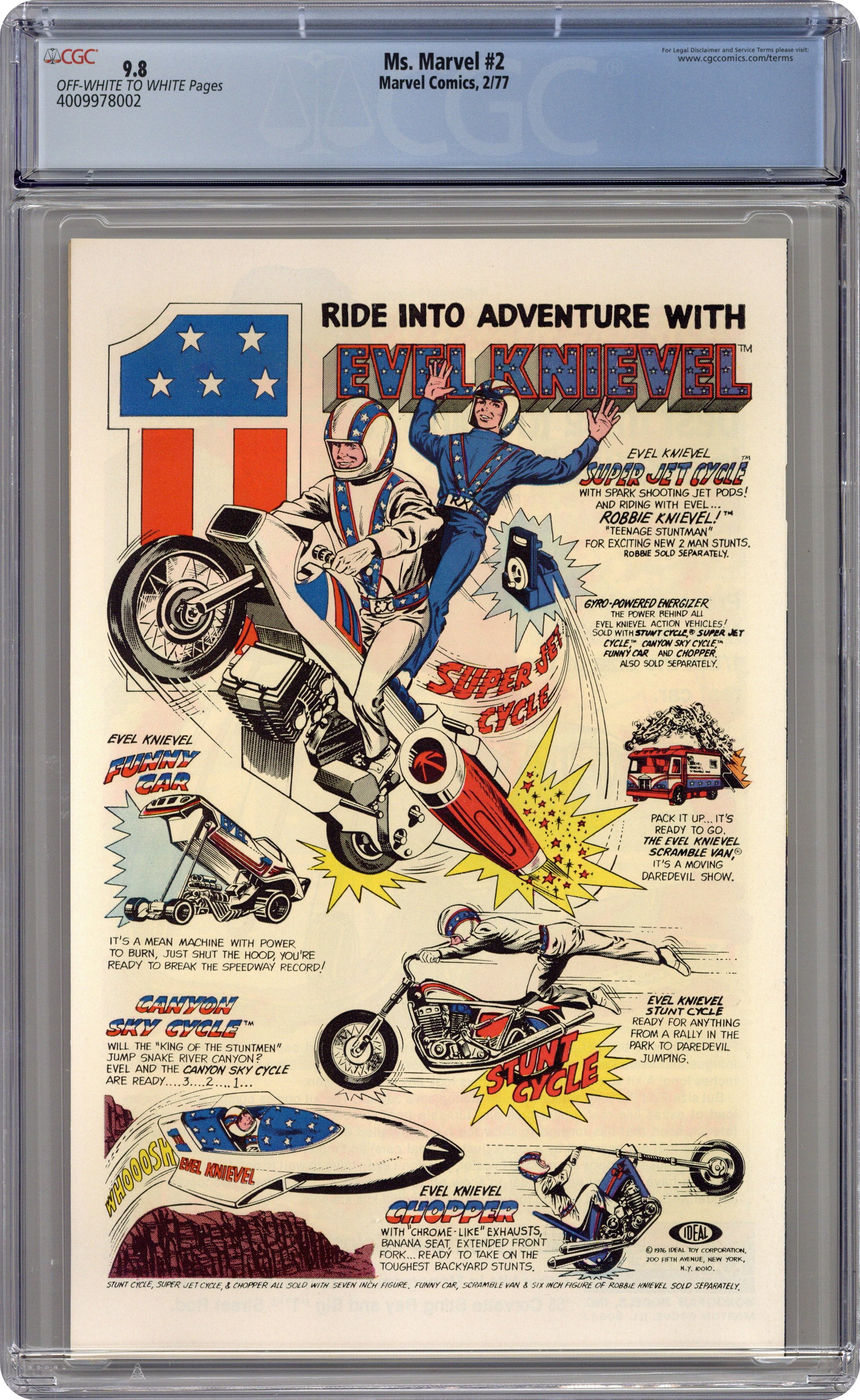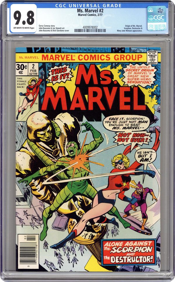 Cover pencils by John Buscema, inks by Dick Giordano. Enigma of Fear!, script by Gerry Conway, pencils by John Buscema (breakdowns) and Joe Sinnott (finished art), inks by Joe Sinnott; Kerwin becomes the Destructor and promises to take down Ms. Marvel for AIM; Scorpion escapes from AIM's clutches; Carol, freaked out by her blackouts and lack of memory, visits her friend Barnett who discovers she is Ms. Marvel during a hypnotic session but fails to tell her; Ms. Marvel takes on Scorpion and Destructor. Ink Stains on Virgin Paper article by David Anthony Kraft; Origin of Ms. Marvel revealed; Mary Jane cameo. Ad for Ricochet Racers featuring Spider-Man and Captain America. 36 pgs. $0.30. Cover price $0.30. Grade: CGC 9.8 explanation of grade Condition: Used (collectible)