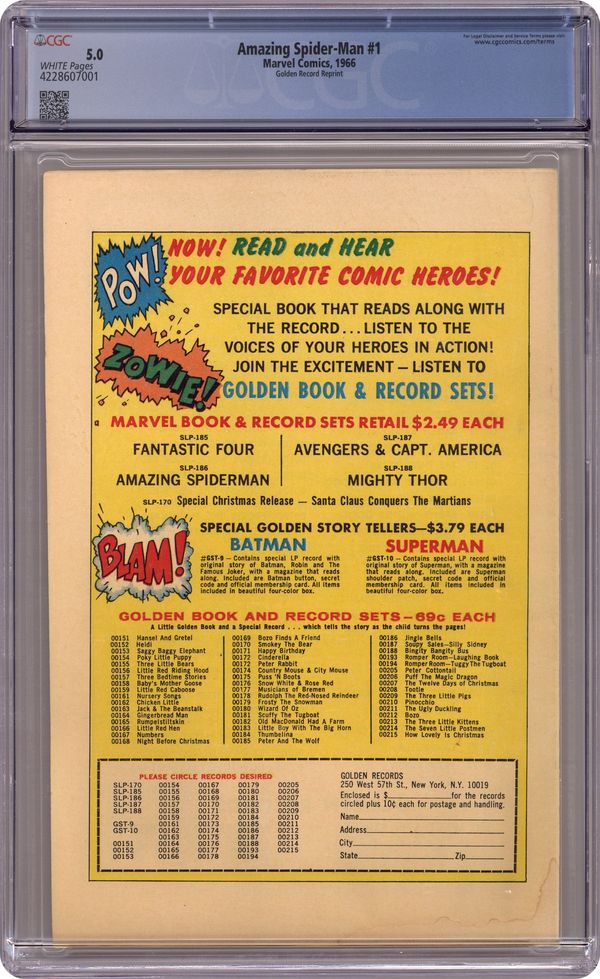 Ended Jul 13 2023 Winning Bid $908 COMIC ONLY NO RECORD. The Amazing Spider-Man Golden Record Reprint (28-pages, full-color, standard comic format) was produced in 1966 and reprints Amazing Spider-Man #1. Although the reprint, at first glance, looks like the original, there are differences. There is no cover price on the reprint, and the back cover, as well as the inside covers, promote the Golden Record LP series of which the Amazing Spider-Man #1 is a part. The four Marvel Golden Record LPs came with a reprint comic, and each originally sold for $2.49 (record and comic together). In addition to the Amazing Spider-Man LP, there were records produced for Thor (Journey into Mystery #83), Avengers #4; and Fantastic Four #1, all with their own reprint comic. We bought these sets when they first appeared and can still remember following the story in the comic reprint while the record played and the narrator read the story to us. Just to make sure we didn't lose our place, he would say "Turn page," each time he finished the last panel on a page. Grade: CGC 5.0 explanation of grade Condition: Used (collectible)