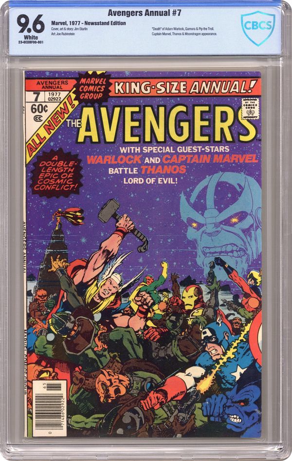 "The Final Threat" Part 1 of 2. Guest-starring Captain Marvel and Adam Warlock. Script by Jim Starlin. Art by Jim Starlin (breakdowns) and Joe Rubinstein (finishes). Cover by Jim Starlin. One of the epochal annuals of the bronze age! A stormy night at Avengers Mansion is interrupted by the sudden arrival of Captain Marvel and Moondragon. The duo feels that the universe is in imminent danger! Their fears are confirmed moments later when Adam Warlock also arrives and delivers troubling news: Thanos has a new plan for obliterating the universe! The evil Titan sends a giant space armada to attack Earth, while he prepares to blow up the sun via his massive star gem! However, the mightiest heroes on Earth intercept the fleet and set their sights on destroying Thanos' instrument of stellar genocide! Tragically though, Warlock falls in battle vs. the mad Titan. Leaving the trio of Iron Man, Thor, and Captain Marvel as the final hope of the universe! Can the Kree warrior, thunder god, and golden avenger triumph over Thanos? Story continues in Marvel Two-in-One Annual 2. Deaths of Gamora, Pip, and Warlock. Avengers lineup: Beast, Captain America, Iron Man, Scarlet Witch, Thor, and the Vision. (Notes: First appearances of the Space Gem, the Mind Gem, and the Reality Gem, and the first time all six Infinity Gems were in a story. Thanos previously appeared in Warlock 15. This annual was reprinted in 1993 in the trade paperback: The Greatest Battles of the Avengers.) 52 pgs. Cover price $0.60. Grade: CBCS 9.6 explanation of grade Condition: Used (collectible)