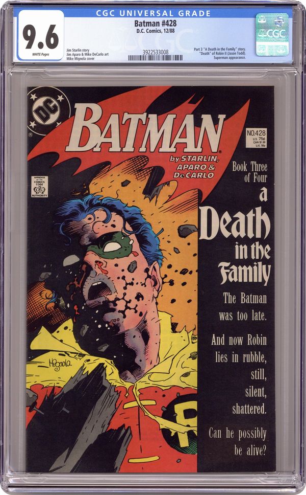 Ended Aug 3 2023 Winning Bid $86 First printing. Direct Edition. Cover art by Mike Mignola. "A Death in the Family" part 3 of 4, script by Jim Starlin, pencils by Jim Aparo, inks by Mike DeCarlo; Death of Sheila Haywood; Burial of Sheila Haywood and Jason Todd; The Joker becomes the Iranian Ambassador to the U.N. Results of Phone Poll as to whether Robin dies this issue or not. NOTE: Most issues from 397-432 were reprinted in 1989 and sold in multipacks. These 2nd and 3rd prints have back cover ads dated 1989. 36 Pages, Full Color. Cover price $0.75. Grade: CGC 9.6 explanation of grade Condition: Used (collectible)