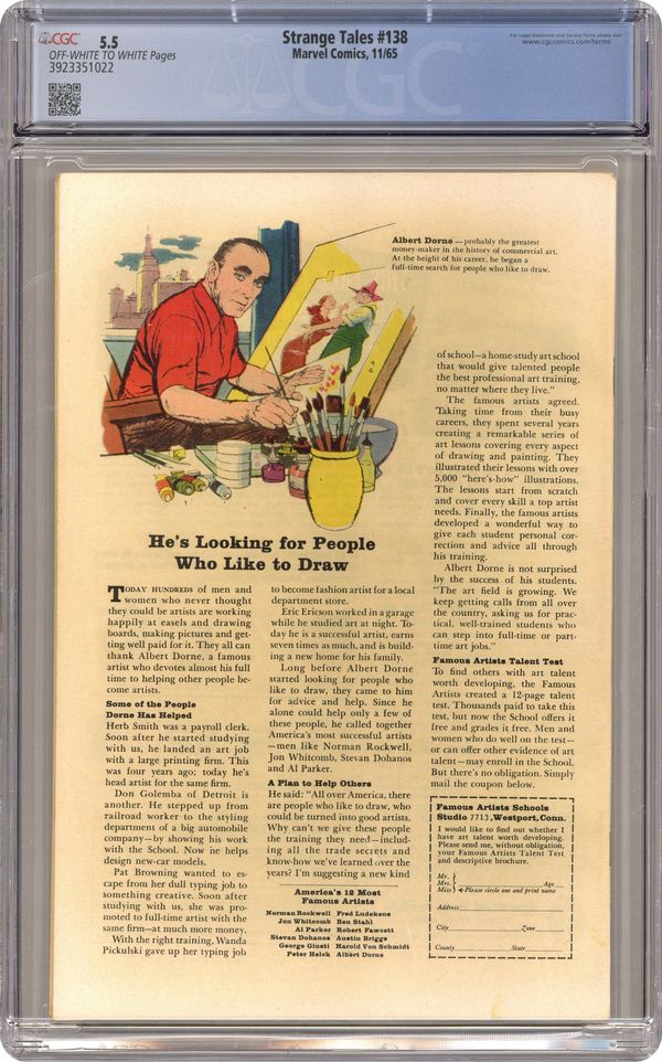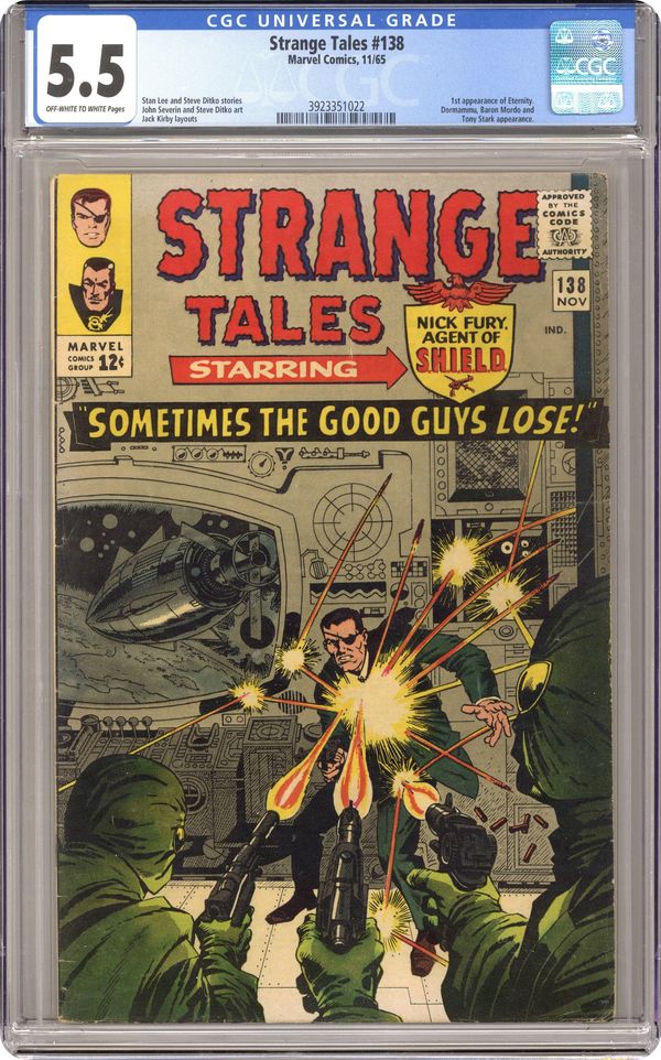 Cover pencils by Jack Kirby, inks by John Severin. "Sometimes the Good Guys Lose!", script by Stan Lee and Jack Kirby (co-plot), pencils by Jack Kirby (layouts) and John Severin, inks by John Severin; Aboard SHIELD's Intercontinental Ballistic Plane Fury uses the Televiewer Tube to locate the Betraton Bomb launch site; It is destroyed but the bomb was already launched; Agent G unsuccessfully implores her father, Imperial Hydra to come to his senses; He sends HYDRA's Fox Division to deliver his terms to every nation on Earth; Tony Stark prepares to show Fury the Braino-Saur,a new weapon when HYDRA agents capture him. "If Eternity Should Fail!", script by Steve Ditko (plot) and Stan Lee (dialogue), art by Steve Ditko; In another dimension that defies description, Dr. Strange comes face-to-face with Eternity, who learns that Strange is indeed worthy of The Ancient One's trust; He knows that if Mordo & Dormammu are not stopped, all mankind will be in jeopardy; But after all Strange has been through, Eternity tells him he already has the power he needs; First appearance of Eternity; Appearance by Clea. 36 pgs., full color. Cover price $0.12. Grade: CGC 5.5 explanation of grade Condition: Used (collectible)