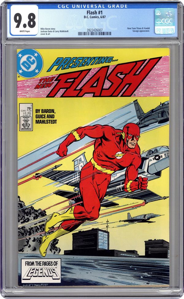 Ended Jul 13 2023 Winning Bid $255 Direct Edition. On his way to deliver a heart for transplant, Wally West comes across Vandal Savage. Part 1 of 2, continued next issue. Script by Mike Baron, pencils by Jackson Guice, inks by Larry Mahlstedt. Teen Titans cameo. Guice/Mahlstedt cover. Cover price $0.75. Grade: CGC 9.8 explanation of grade Condition: Used (collectible)