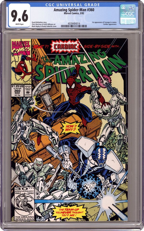 Ended Nov 24 2023 Winning Bid $28 Direct Edition. "Death Toy!" Part 2 of 2. Script by David Michelinie. Pencils by Chris Marrinan. Mark Bagley. Inks by Keith Williams. Cover by Mark Bagley and Randy Emberlin. At the Tech-Toy warehouse, Cardiac and the wall-crawler come to a meeting of the minds about their pursuits of justice! Perhaps it's possible for them to work together after all! The next evening at Stane International, Spider-Man and Cardiac team up to stop the illegal manufacturing of military weapons! Could this be the beginning of a beautiful friendship? Not quite! Meanwhile, a new blood-hued super-villain makes his first savage kill...the first of many! Cameo appearances by Carnage, Mary Jane Watson, Ben Urich, Joy Mercado, and J. Jonah Jameson. Origin of Cardiac. (Notes: Cardiac returns in Amazing Spider-Man 376. The letters page contains a statement of ownership: average print run 470,075; average paid circulation 340,977.) 36 pages. $1.25 cover price. Cover price $1.25. Grade: CGC 9.6 explanation of grade Condition: Used (collectible)