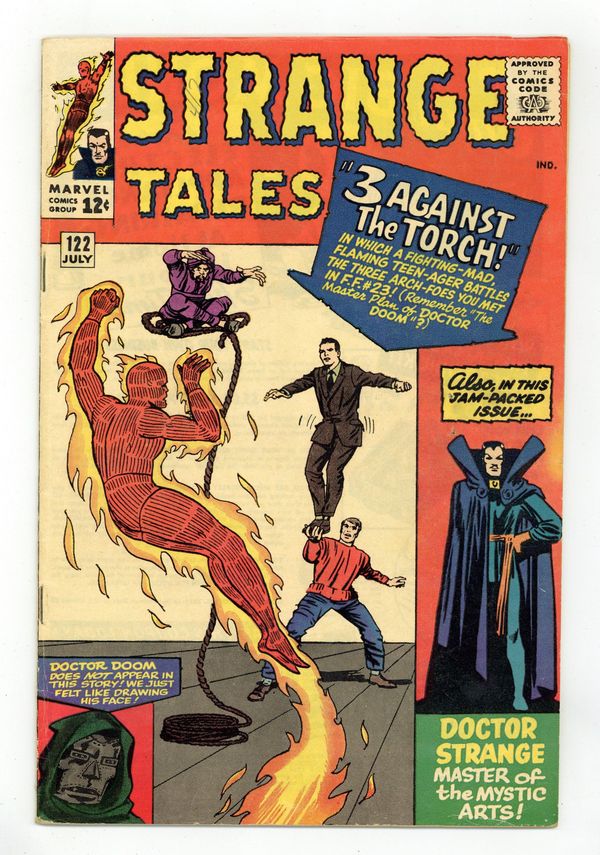 Cover pencils by Jack Kirby and Steve Ditko (Doctor Strange), inks by George Roussos and Steve Ditko (Doctor Strange). The Human Torch mixes it up with Doctor Doom and his allies in "3 Against The Torch!", script by Stan Lee (co-plot, dialogue) and Dick Ayers (co-plot), pencils by Dick Ayers, inks by George Roussos (as George Bell); In flashback we see the how Dr. Doom used "The Terrible Trio" to trap the Fantastic Four, then discarded his underlings by sending them into another dimension!; With Doom gone, the three return to Earth, where they're foolish enough to try taking on The Torch again, figuring 3 against 1 would be no contest. "The World Beyond," script by Stan Lee and Steve Ditko (co-plot), pencils by Steve Ditko, inks by George Roussos; Weary from his struggles against supernatural forces, Strange falls asleep, carelessly forgetting to cast a protective spell over himself and becoming a prisoner of the Nightmare World!; Nightmare imprisons Strange, the only human who has ever defeated him, then says he's bored and looks forward to other victims; Strange summons The Gulgol, a creature that never sleeps. (Reprinted in Giant-Size Marvel Triple Action # 1.) "Strange Mission" text story. 36 pages, full color. Cover price $0.12. Grade: VG+ 4.5 explanation of grade Condition: Used (collectible)