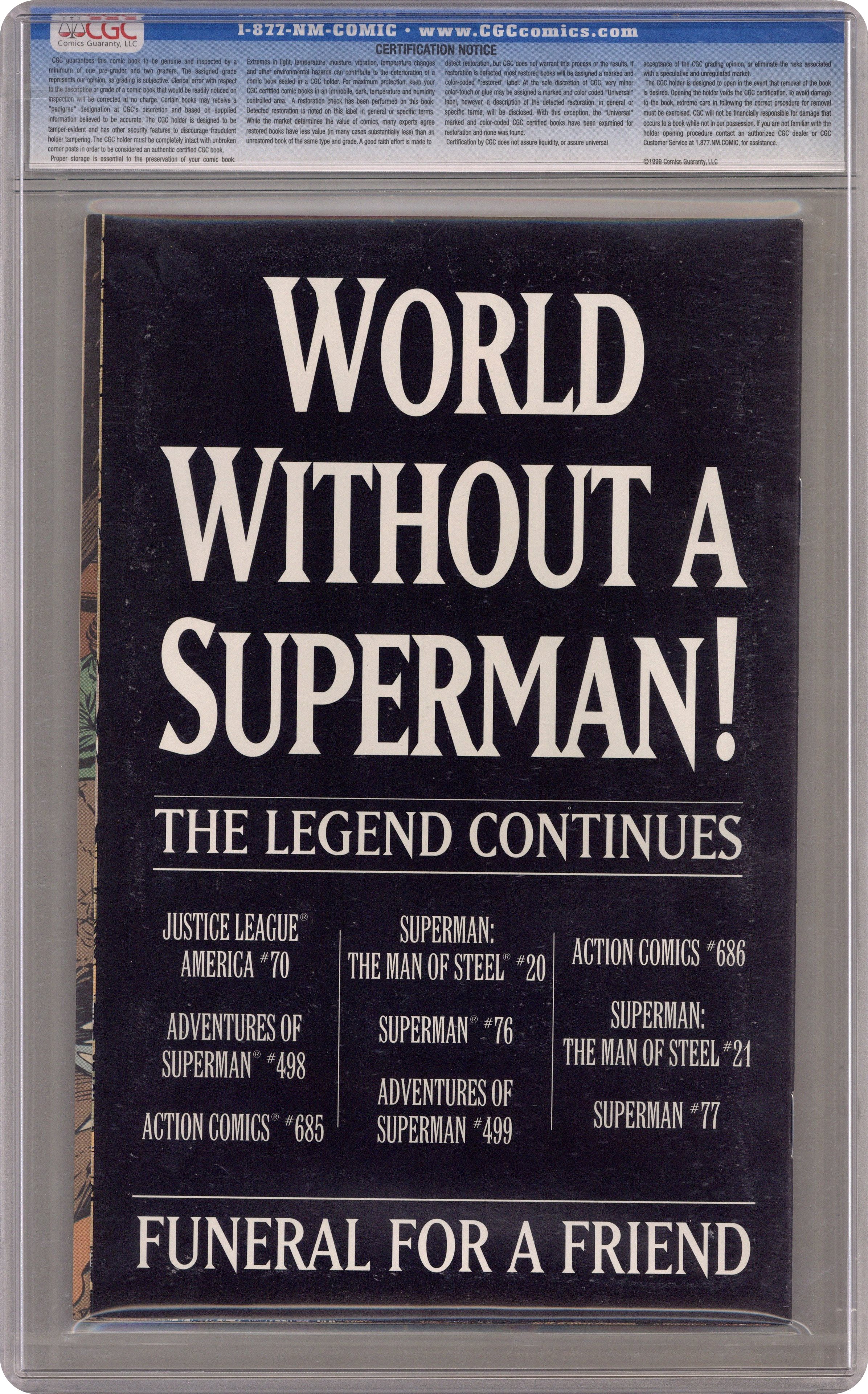 Ended Jul 13 2023 Winning Bid $190 1st printing. Doomsday! Part 7 of 7. "Doomsday!" Story by Dan Jurgens. Art by Dan Jurgens and Brett Breeding. Here it is, the issue that rocked the DC Universe. An unstoppable force named Doomsday crash landed on Earth and has cut a swath of death and destruction across the country, all the way to Metropolis. Even the Justice League, the world's premiere super-team, was powerless before this creature's might. Now one man stands defiantly in Doomsday's way and vows that the creature's insanity stops here. Superman fights his strongest opponent to the death in the streets of Metropolis. NOTE: The event of "The Death of Superman" was so huge that it was reported on by the national media. - Odinson, Lonestar Comics Archivist Cover price $1.25. Grade: CGC 9.8 explanation of grade Condition: Used (collectible)