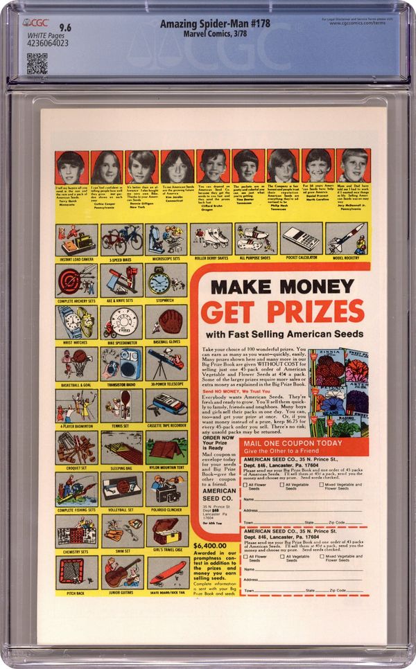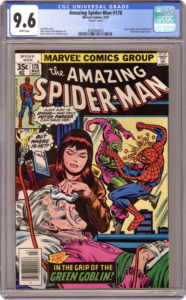 The"Green Grows the Goblin!" Part 3 of 5. Script by Len Wein. Art by Ross Andru (breakdowns) and Jim Mooney (finishes). Cover by Ross Andru and Joe Sinnott. If a picture is worth a thousand words, then the frantic cover says it all! Aunt May lies near death in her hospital bed awaiting life-saving surgery! But the doctors can't operate until her next of kin (aka the wondrous wall-crawler) signs the consent forms! Oh no! Where is the web-slinger? Currently fighting for his own life vs. the Green Goblin! It's a painful predicament in more ways than one for the Spectacular Spider-Man! Cameo appearances by Silvermane, Glory Grant, Joe Robertson, J. Jonah Jameson, Anna Watson, and Harry Osborn. (Note: The letters page includes a statement of ownership: average print run 587,702; average paid circulation 281,860.) 36 pages. Cover price $0.35. Grade: CGC 9.6 explanation of grade Condition: Used (collectible)