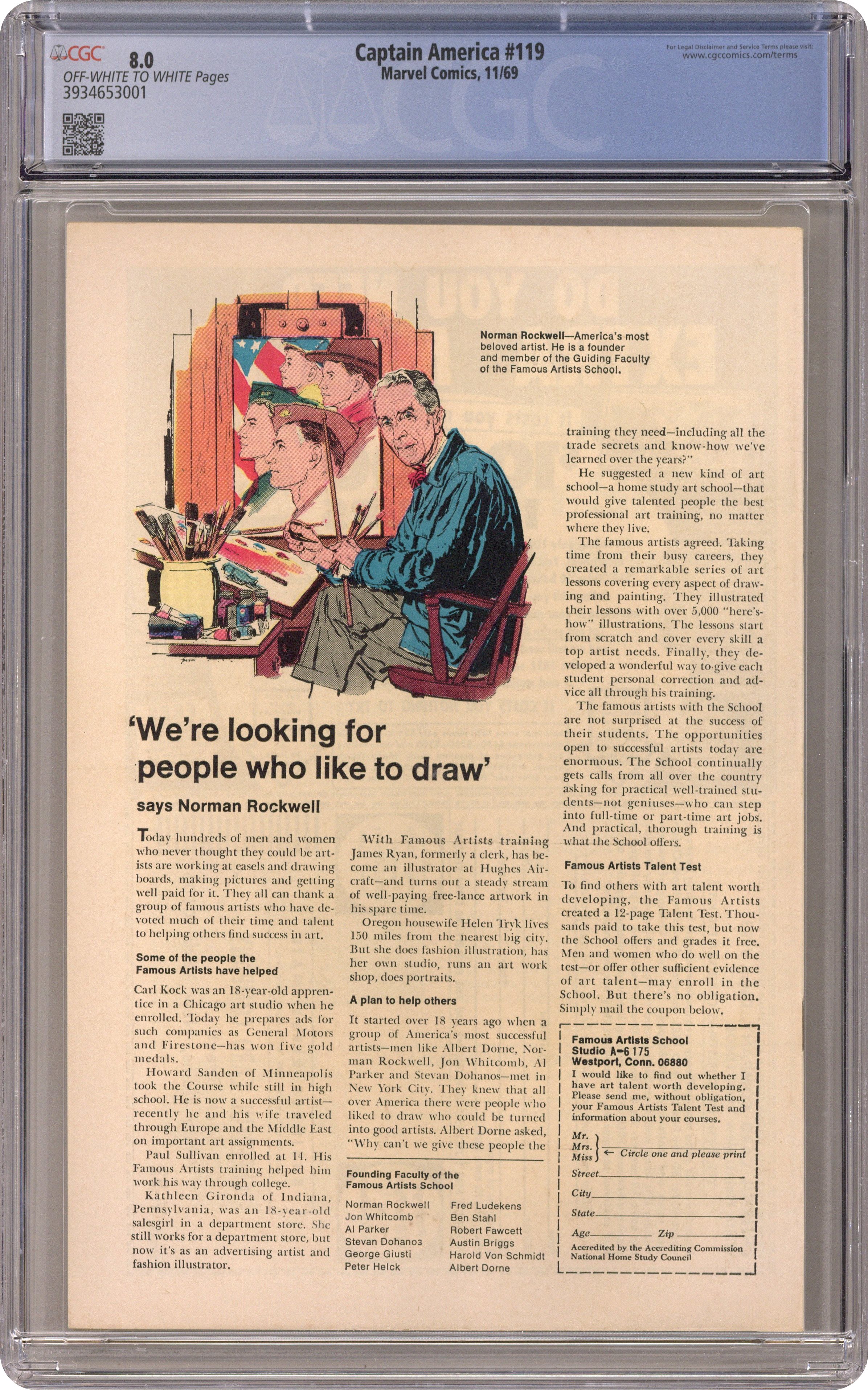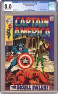 Ended Oct 13 2023 Winning Bid $42 Cover pencils by Gene Colan, inks by Joe Sinnott. The dramatic conclusion to the story that began back in issue 115 in "Now Falls the Skull!", script by Stan Lee, pencils by Gene Colan, inks by Joe Sinnott; The Red Skull uses the Cosmic Cube to change bodies back with Captain America; Falcon realizes the man who he has been working with is Captain America; The Skull uses the Cube to toy with Cap and the Falcon during their battle; Elsewhere, MODOK activates his newly-created Catholite Block to disrupt the power of the Cosmic Cube; The Red Skull uses the remaining power of the Cube to disappear. Letter to the editor from writer Alan Brennert. 36 pgs., full color. $0.15. Cover price $0.15. Grade: CGC 8.0 explanation of grade Condition: Used (collectible)