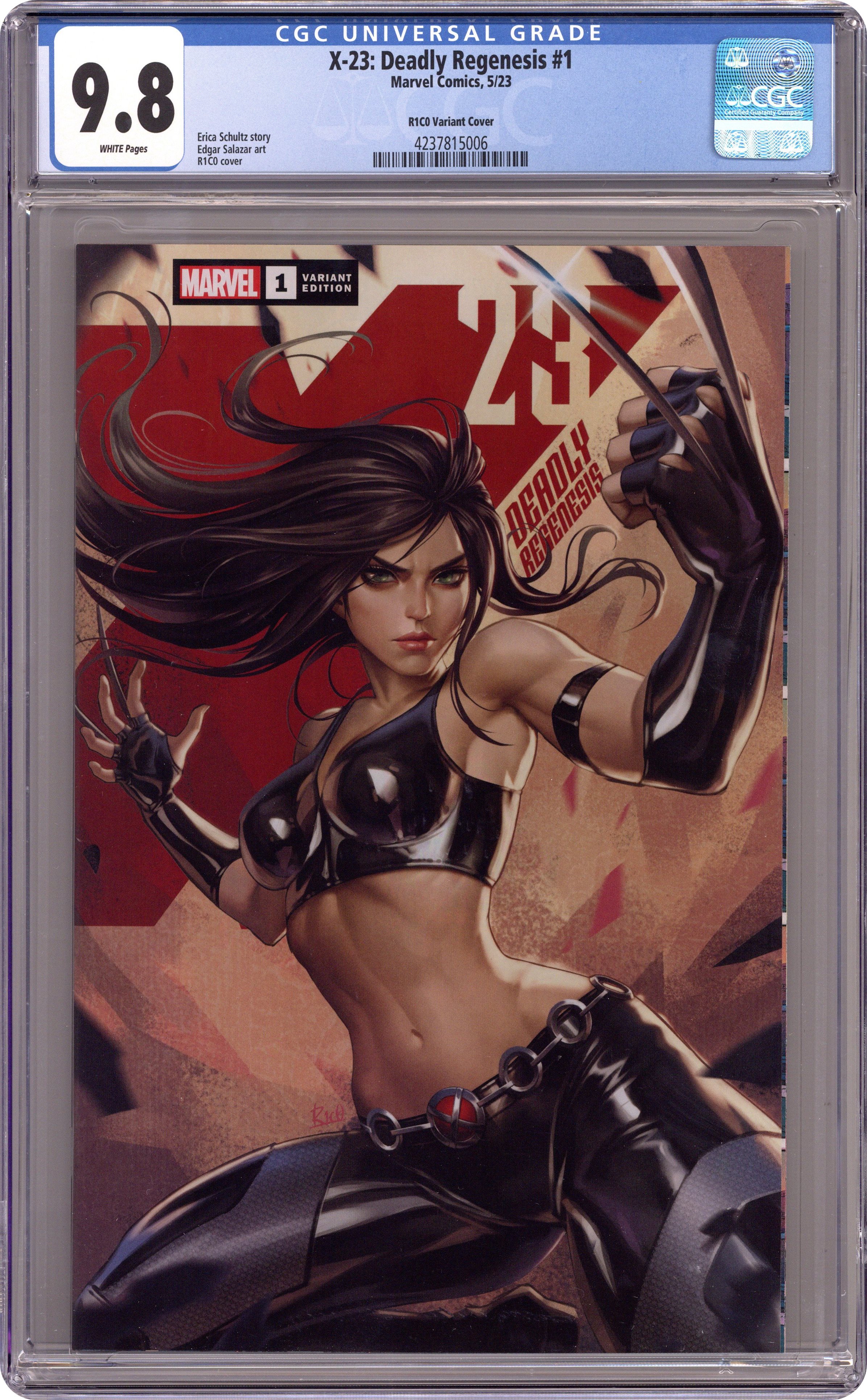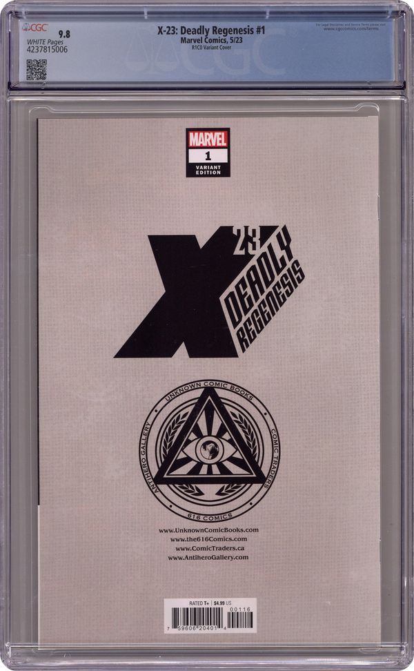 Comics Illuminati (Unknown Comics, Comic Traders, Anti-Hero Gallery, and The 616 Comics) Exclusive Cover by R1C0. Written by Erica Schultz. Art by Edgar Salazar. ASSASSIN OR X-MAN? THE DEADLY DAYS OF X-23! LAURA KINNEY, A.K.A. X-23, was cloned from LOGAN and trained by the Facility to be a deadly assassin. Even as she tries to put that life behind her, forces will try to drag her back - and she'll fight them tooth and claw! Beset by NEW ENEMIES - as well as OLD FAVORITES! - and set during X-23's days as a member of X-MEN and X-FORCE, when she walked away from the island of UTOPIA to find where she truly belongs, join us for an ALL-NEW story in the fan-favorite saga of Laura Kinney! 40 pages, full color. Rated T+ Grade: CGC 9.8 explanation of grade Condition: Used (collectible)