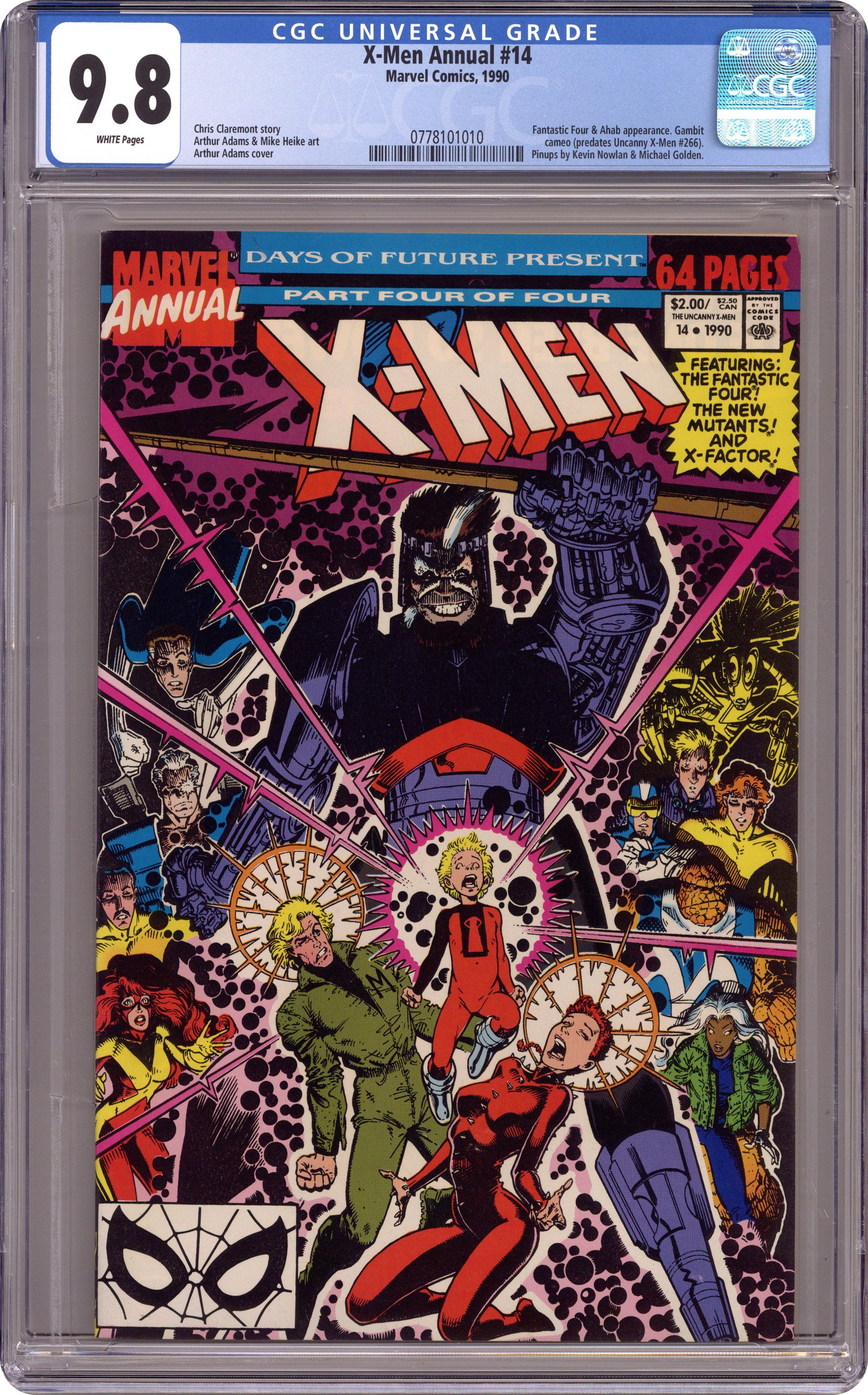 Ended Jun 20 2023 Winning Bid $225 Direct Edition. Days of Future Present part four of four "You Must Remember This" Guest starring the Fantastic Four, the New Mutants, and X-Factor. Script by Chris Claremont, pencils by Art Adams, inks by Dan Green, Bob Wiacek, Al Milgrom, Art Thibert, and Steve Mancuse. First appearance of Gambit (brief cameo). Wolverine, Jubilee, and Psylocke star in "The Fundamental Things." Script by Claremont, pencils by Mark Heike, inks by Geof Isherwood. Pin-ups by Kevin Nowlan and Michael Golden. Adams cover. 68 pgs. Cover price $2.00. Grade: CGC 9.8 explanation of grade Condition: Used (collectible)