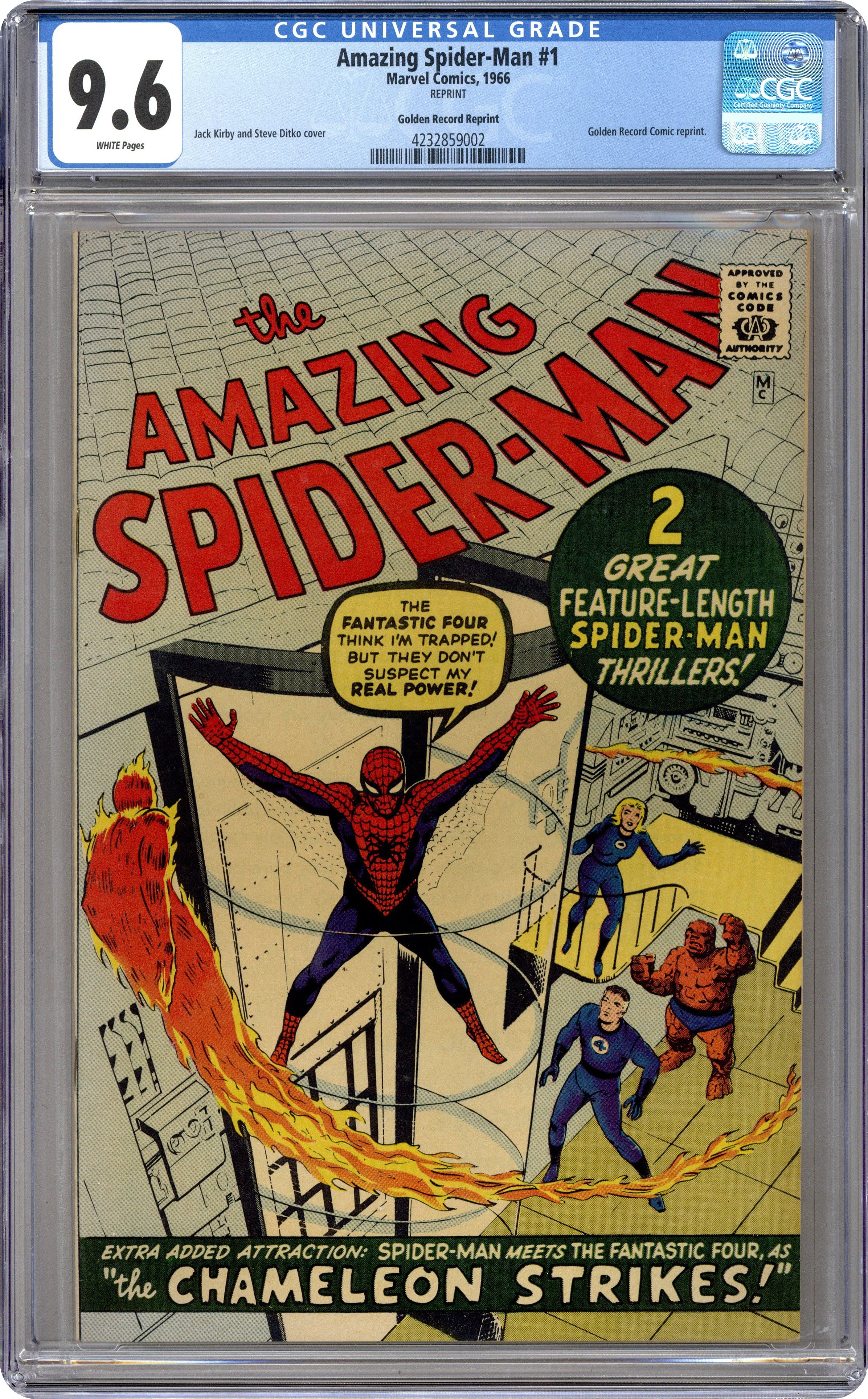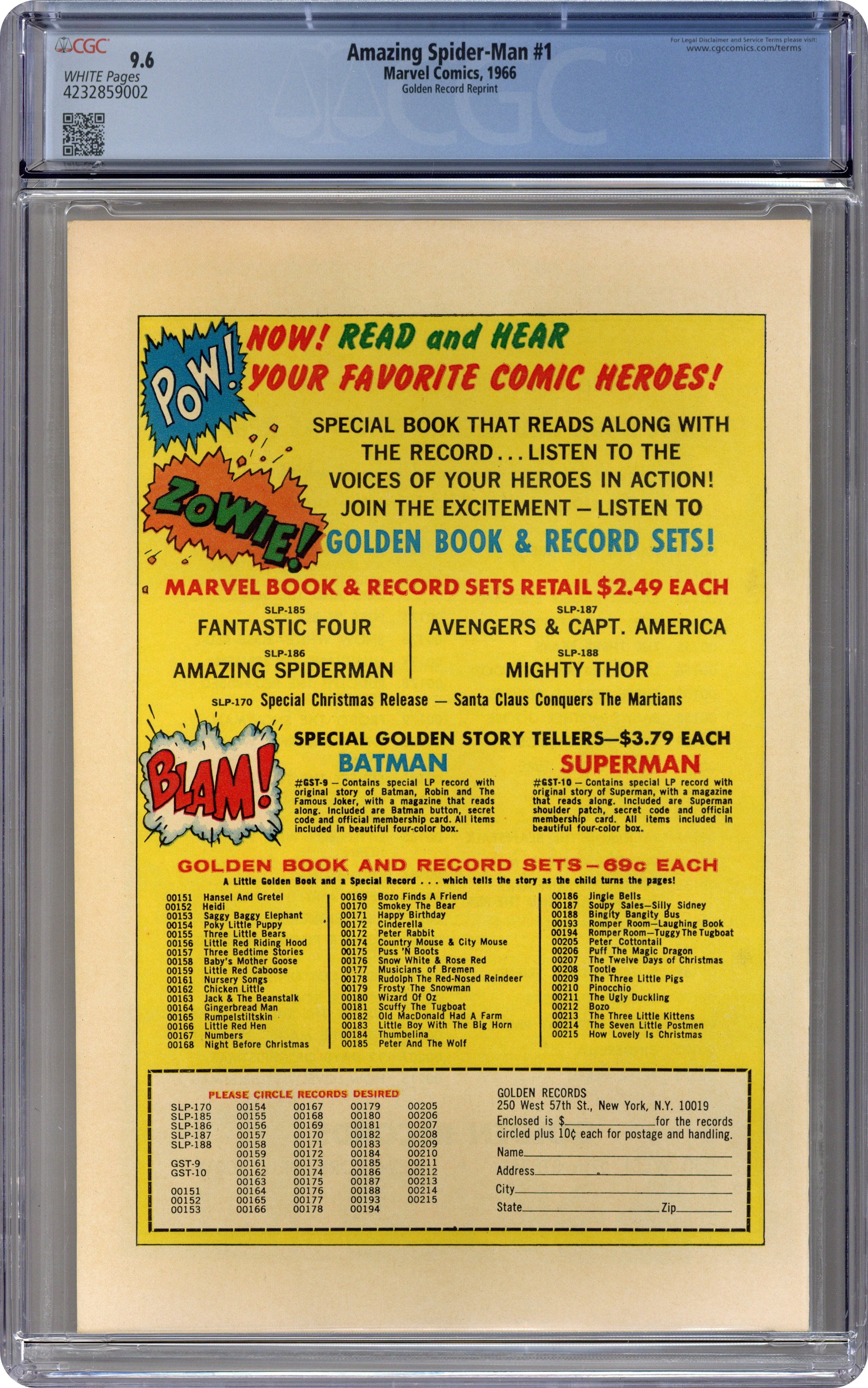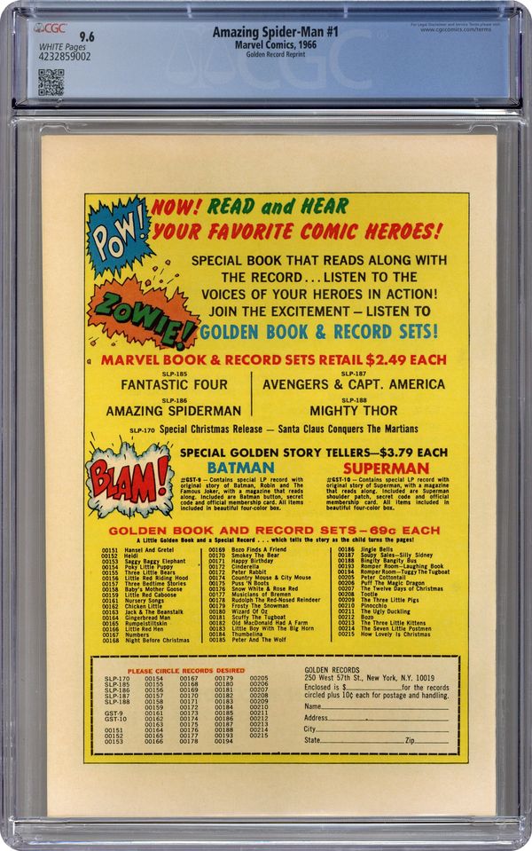 COMIC ONLY NO RECORD. The Amazing Spider-Man Golden Record Reprint (28-pages, full-color, standard comic format) was produced in 1966 and reprints Amazing Spider-Man #1. Although the reprint, at first glance, looks like the original, there are differences. There is no cover price on the reprint, and the back cover, as well as the inside covers, promote the Golden Record LP series of which the Amazing Spider-Man #1 is a part. The four Marvel Golden Record LPs came with a reprint comic, and each originally sold for $2.49 (record and comic together). In addition to the Amazing Spider-Man LP, there were records produced for Thor (Journey into Mystery #83), Avengers #4; and Fantastic Four #1, all with their own reprint comic. We bought these sets when they first appeared and can still remember following the story in the comic reprint while the record played and the narrator read the story to us. Just to make sure we didn't lose our place, he would say "Turn page," each time he finished the last panel on a page. Grade: CGC 9.6 explanation of grade Condition: Used (collectible)