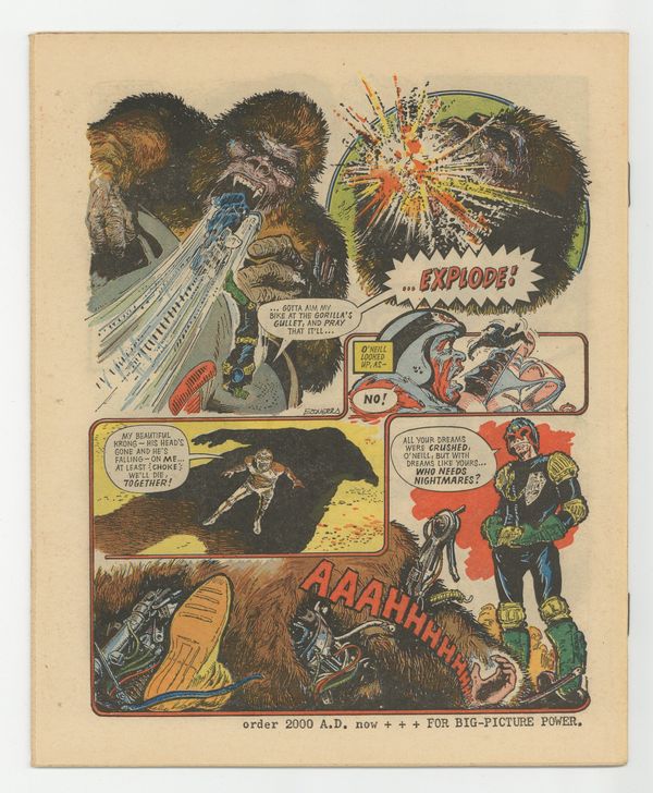 Ended Jul 11 2023 Winning Bid $98 Cover by Barry Mitchell. March 26, 1977. Prog: 05 Featuring Invasion "The Resistance" (Part 5 of 5), written by Gerry Finley-Day, art by Sarompas; Bill Savage and The Mad Dogs unleash their fury on the Volg army, taking up position in Trafalgar Square then moving to their hideout in the Isle of Dogs. Dan Dare (Part 5 of 11), written by Kelvin Gosnell, art by Massimo Belardinelli; As Dare and Monday continue to explore the surface of Jupiter, the vile biologically advanced aliens attack; When Dare and Monday regain consciousness, they discover they're "inside a living nightmare!" Judge Dredd in "Krong," written by Malcolm Shaw, art by Carlos Ezquerra; When the curator of a movie special effects museum gets a little frisky with his animatronics, Judge Dredd is called in to enforce the law. Flesh: Book 1 (Part 5 of 19), written by Studio Giolitti, art by Ramon Sola; First Old One Eye, now "Claw" Carver; Will Earl Reagan ever get a break, and will the tyrannosaur gland save Joe's life? Harlem Heroes (Part 5 of 27), written by Tom Tully, art by Dave Gibbons; Against all odds, the Harlem Heroes win their match against the Baltimore Bulls; As they leave the Aero-drome, the head of Trans-world Networks, Ulysses Cord, offers them luxuries that put Giant on edge. M.A.C.H.1 "Probesnatch," written by Nick Allen, art by John Cooper; While on vacation, Britain's deadliest secret agent is accosted by Otto Brandt who wants the secrets of hyperpower. 32 Pgs., B&W. 0.08 GBP. Grade: FN/VF 7.0 explanation of grade Condition: Used (collectible)