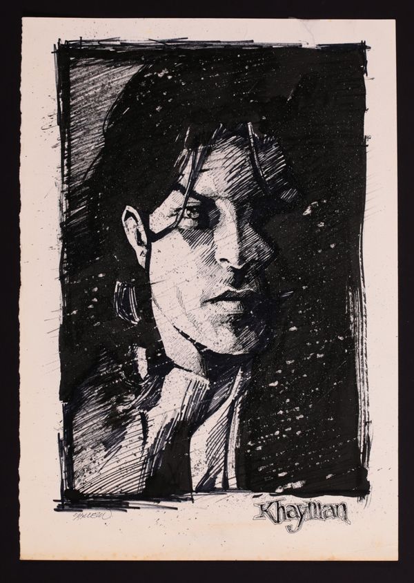 A gorgeous piece, full of texture and mood, this portrait of the vampire Khayman, who would (spoilers!) go on to become the world's oldest vampire. Cariello's work on this piece is impressive, blending brush, pen, and marker with a scraping technique that adds a gorgeous final touch to the page. Signed by the artist. Pen, marker, and ink on art stock. 8 3/4" x 12 3/4", B&W.