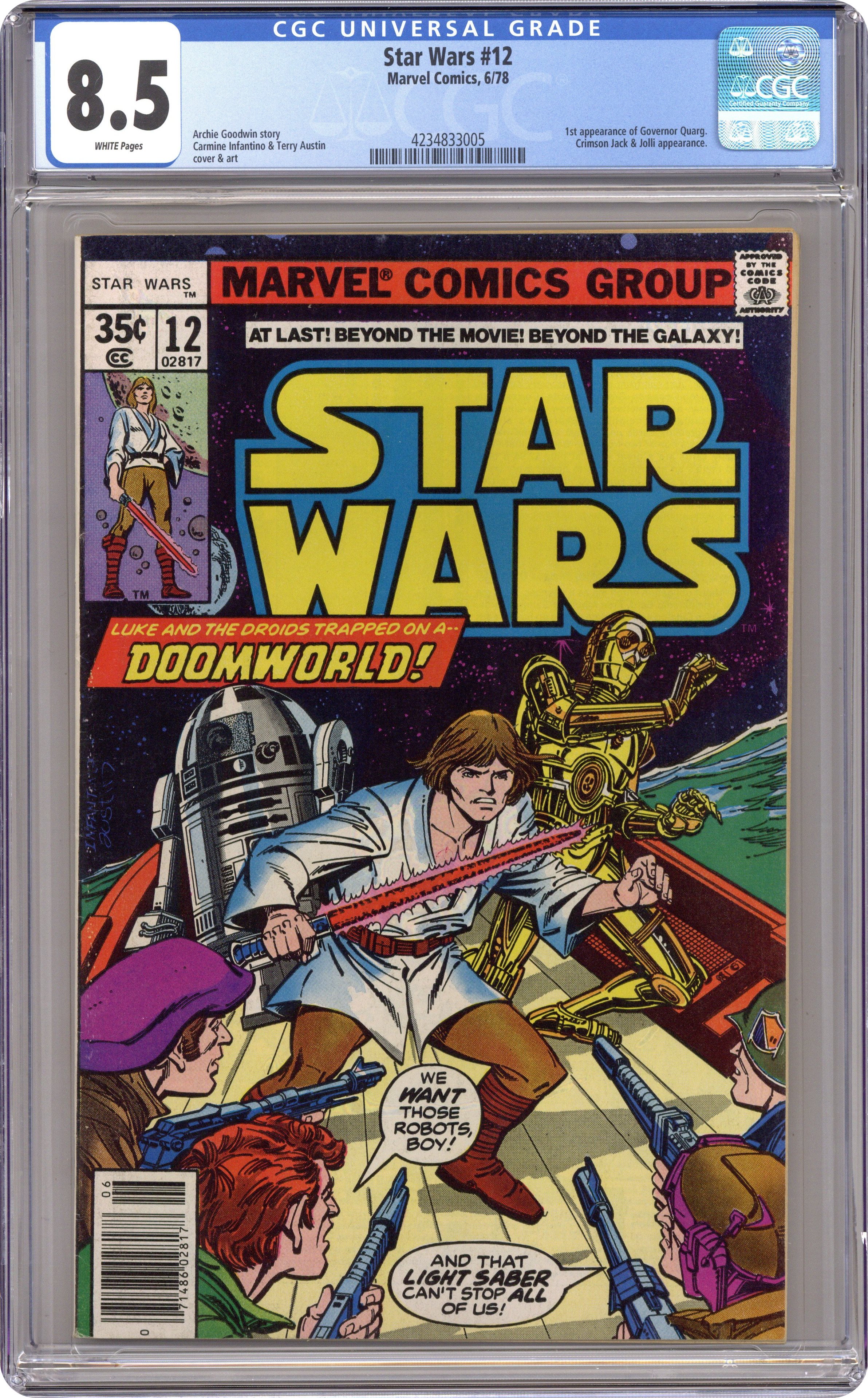 Ended Jun 14 2023 Winning Bid $33 "Doomworld!" Written by Archie Goodwin. Art by Carmine Infantino and Terry Austin. While searching for a new location of the Rebel's set up shop, Luke Skywalker crash landed on a dangerous world of death and betrayal. Can this young hero hope to survive on Doomworld? Meanwhile, Han Solo attempts to bluff Crimson Jack, one of the galaxy's deadliest space pirates. Cover price $0.35. Grade: CGC 8.5 explanation of grade Condition: Used (collectible)