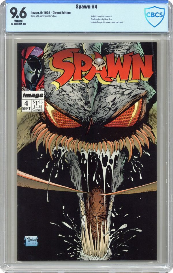 Includes Coupon - "Questions!" Part 4 of 4. Featuring a humorous cameo by the Savage Dragon. Created, story, and art by Todd McFarlane (1-page Dave Sim art; 1-page Whilce Portacio art). Featuring the terrifying conclusion to the first arc, "Question," Spawn proves to be harder to kill then his demonic adversary at first thought. Things take a turn for the worse when the devil Al Simmons made a deal with decides it time to intervene. Version A does include the full page coupon in the middle of the book that could be used to order an Image # 0 mail order comic. Cover price $1.95. Grade: CBCS 9.6 explanation of grade Condition: Used (collectible)