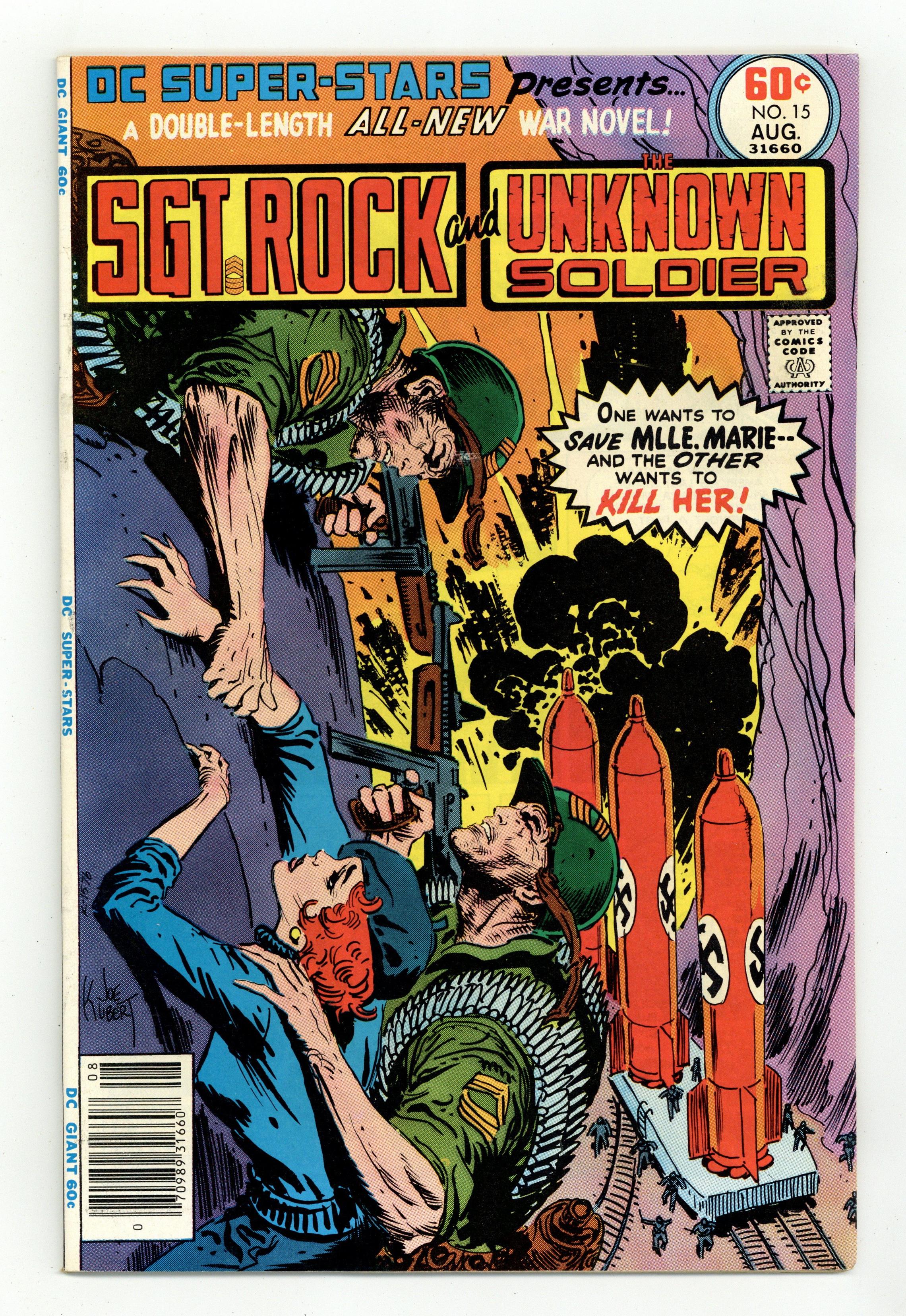 Ended Jun 29 2023 Winning Bid $11 A double-length all-new war novel! Sgt. Rock and the Unknown Soldier -- one wants to save Mlle. Marie...and the other wants to kill her! Featuring: 30 page Sgt. Rock and the Unknown Soldier story "Heap the Corpses High!" written by Robert Kanigher and drawn by Lee Elias & Romeo Tanghal. Plus: 1 page Secret Army Files text article "Sgt. Rock of Easy Company"; 1 page Secret Army Files text article "The Unknown Soldier"; 1 page Secret Army Files text article "Mademoiselle Marie." Cover by Joe Kubert. Cover price $0.60. Grade: FN 6.0 explanation of grade Condition: Used (collectible)