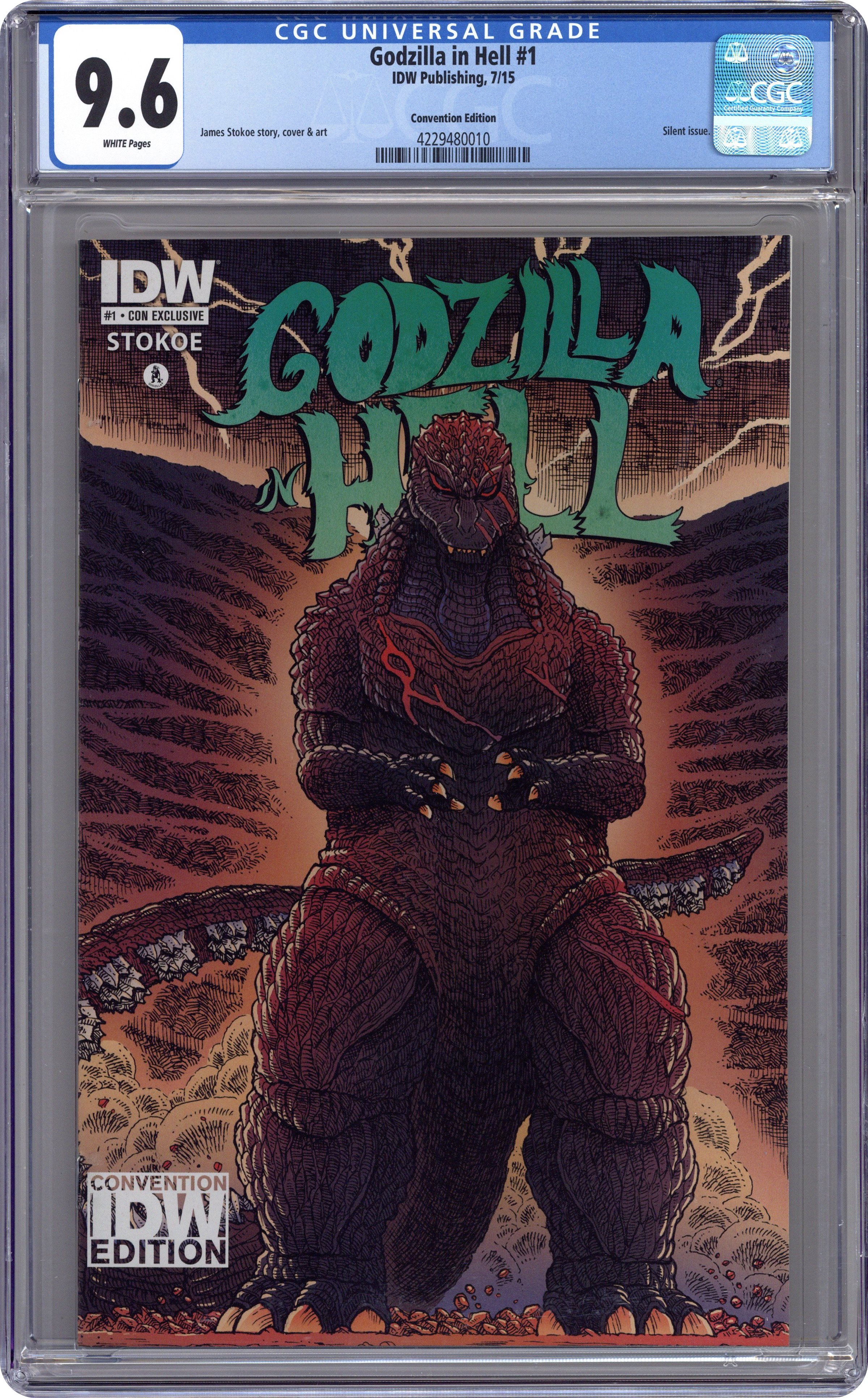 Convention exclusive Cover by James Stokoe. Story and Art by James Stokoe. Godzilla meets his greatest adversary of all time-the impossible tortures of Hell! Each issue of this special miniseries will see Godzilla enter a new level of the underworld to do battle with the impossible. 28 pages, full color. Mature Readers Grade: CGC 9.6 explanation of grade Condition: Used (collectible)