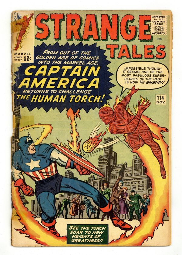 Ended Jun 8 2023 Winning Bid $100 Cover pencils by Jack Kirby, inks by Dick Ayers. "The Human Torch Meets... Captain America", script by Stan Lee (co-plot, dialogue) and Jack Kirby (co-plot, uncredited), pencils by Jack Kirby, inks by Dick Ayers; The Human Torch is upstaged by the return of Captain America, but the Torch realizes that it is his old enemy the Acrobat in disguise and defeats him; This is the first appearance of Captain America since the Golden Age (though it's actually the Acrobat from issue 106 disguised as the hero). "The Bridge" text story. Third appearance of Dr. Strange in "The Return of the Omnipotent Baron Mordo!", script by Stan Lee and Steve Ditko (co-plot), pencils by Steve Ditko, inks by George Roussos; Strange is lured into a trap in England by Baron Mordo, but defeats him with the help of a woman with latent magical talents; First appearance of Victoria Bentley. 36 pgs., full color. Cover price $0.12. Grade: FR 1.0 explanation of grade Condition: Used (collectible)