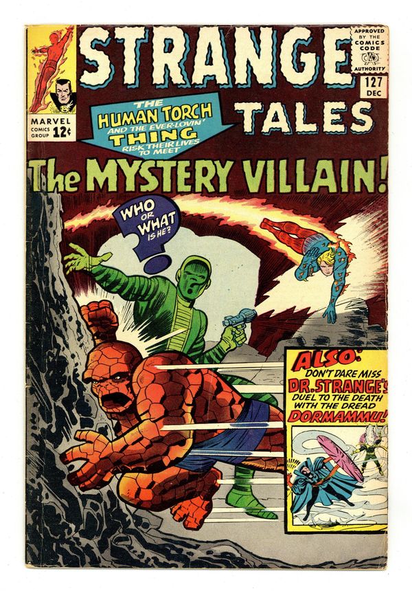 Ended Jun 5 2023 Winning Bid $45 Cover pencils by Jack Kirby and Steve Ditko (inset), inks by Chic Stone and Steve Ditko (inset). The Human Torch and the Thing star in "The Mystery Villain!", script by Stan Lee (co-plot, dialogue) and Dick Ayers (co-plot), pencils by Dick Ayers, inks by Paul Reinman; Following a race, Ben and Johnny complain to Reed that they've done pretty good and don't need a leader; Reed tells them they're free to work on their own; Ben and Johnny take part in a high-speed race, but discover on arrival that they're the only two contestants; Sub-Mariner cameo. "Duel with the Dread Dormammu!", script by Steve Ditko (plot) and Stan Lee (dialogue), art by Steve Ditko; The mysterious girl appears and takes Strange to The Mindless Ones, destructive creatures who are held back from killing by Dormammu's willpower; Dormammu imprisons the girl for betraying him and the battle begins; With Dormammu concentrating on defeating his foe the barrier holding The Mindless Ones collapses; he is forced to join forces with Strange to stop them; Guest starring Clea; Dr. Strange receives his amulet and red-and-yellow cloak of levitation from the Ancient One. A Marvel Masterwork Pin-Up of The Thing, pencils by Jack Kirby, inks by Chic Stone. 36 pgs., full color. NOTE: 2nd appearance of Dormammu and Clea. 1st appearance of The Eye of Agamotto and Cloak of Levitation. 1st battle between Doctor Strange and Dormammu. Cover price $0.12. Grade: VG- 3.5 explanation of grade Condition: Used (collectible)