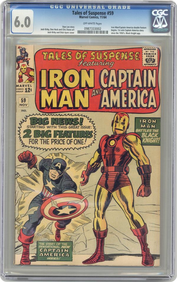 Ended Jul 13 2023 Winning Bid $160 Cover pencils by Jack Kirby, inks by Dick Ayers. Iron Man and Captain America double feature begins. The Avengers guest star in the Iron Man story, "The Black Knight," script by Stan Lee, pencils by Don Heck, inks by Chic Stone; Iron Man battles the Black Knight; Wasp, Giant-Man, Captain America, and Thor appear. Part of the story continues in "Captain America," the first Silver Age Captain America solo story, script by Stan Lee and Jack Kirby (co-plot), pencils by Jack Kirby, inks by Chic Stone; While Cap lounges around Avengers Mansion, thinking about Bucky and his place in the world, a gang of costumed thugs break in intent on stealing any secrets or weapons Stark may have lying about the place, to sell for profit; They figure Cap's "just an acrobat"; Bucky Barnes cameo; First appearance of Jarvis (the Avengers' butler). Letters page begins. 36 pages, full color. Cover price $0.12. Grade: CGC 6.0 explanation of grade Condition: Used (collectible)