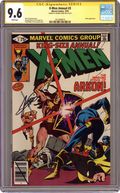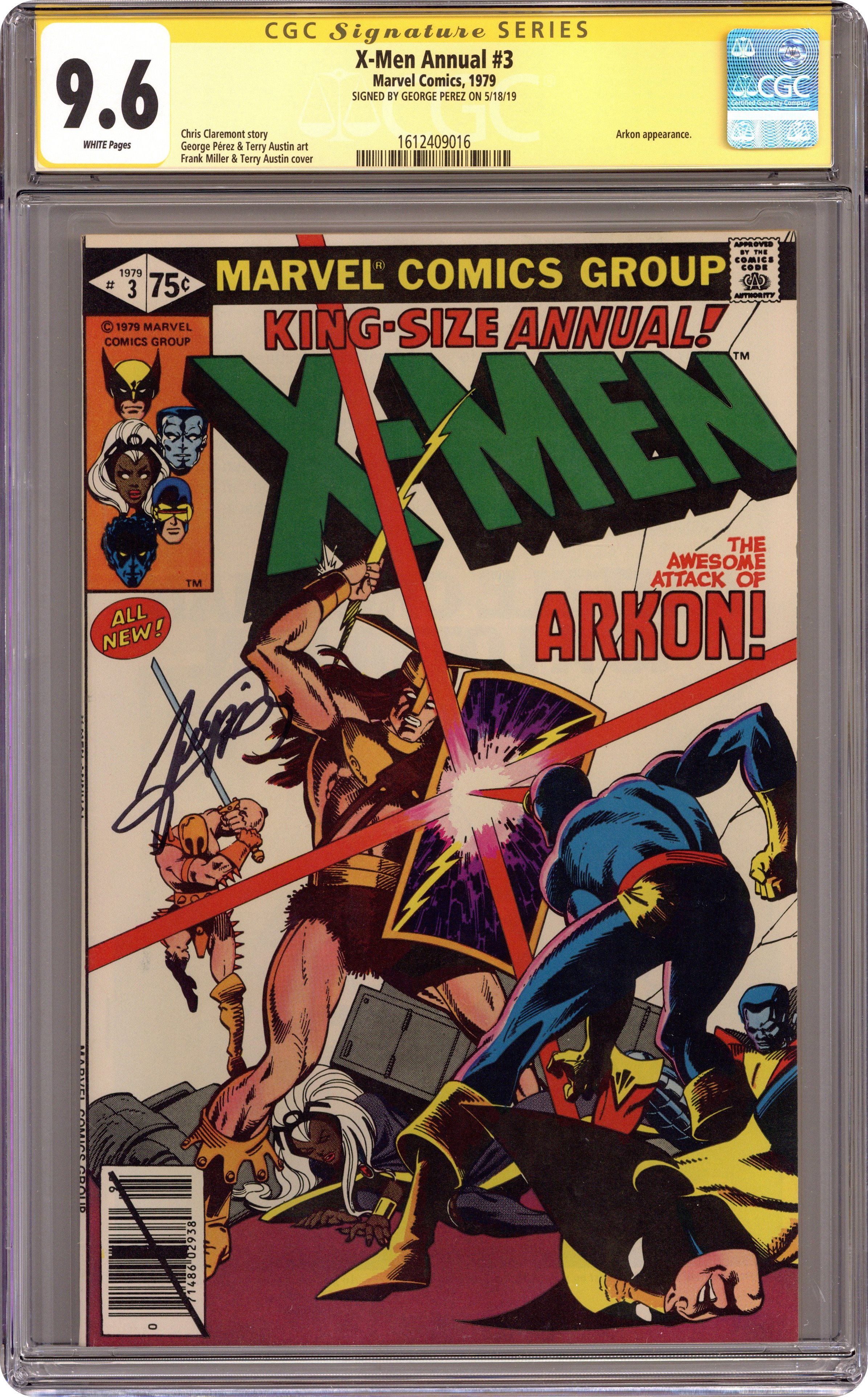 Direct Edition. A Fire in the Sky! - Written by Chris Claremont. Art by George Pérez and Terry Austin. Cover by Frank Miller and Terry Austin. The X-Men battle Arkon and are transported to his world where they are asked to help save it. Story takes place between Uncanny X-Men (1963 1st Series) #124 and 125. Characters in this issue: X-Men [Cyclops; Storm; Wolverine; Colossus; Nightcrawler; Banshee]; Edwin Jarvis; VILLAINS: Arkon; Imperions; CAMEO FLASHBACK: Captain America [Steve Rogers]; Thor; Iron Man [Tony Stark]. 52 pages, full color. Cover price $0.75. Grade: CGC 9.6 explanation of grade Condition: Used (collectible)