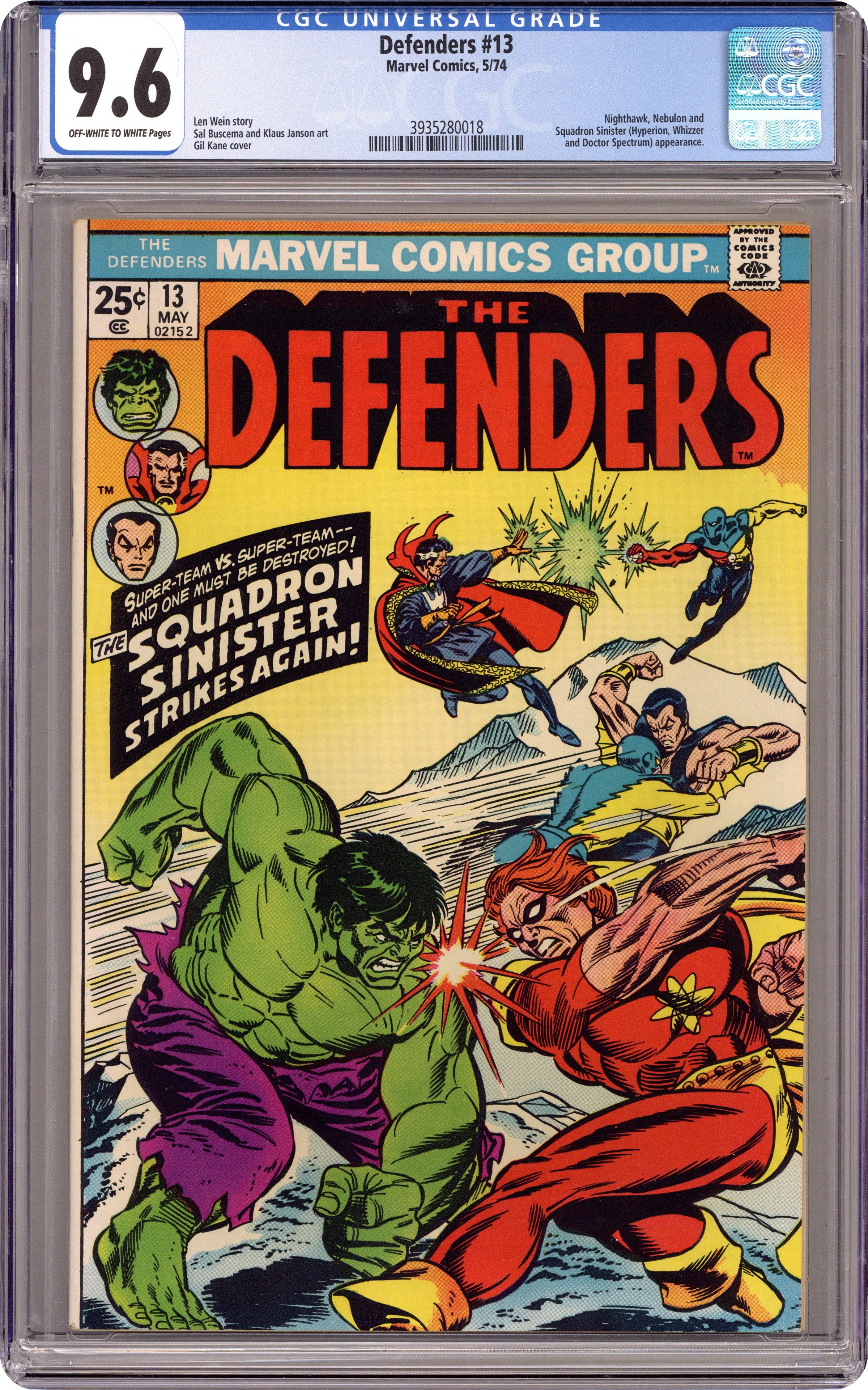 First 25-cent cover price. Cover pencils by Gil Kane, inks by Frank Giacoia. For Sale: One Planet--Slightly Used!, script by Len Wein, pencils by Sal Buscema, inks by Klaus Janson; After deciding to go straight Nighthawk comes to the Defenders for assistance in helping stop the Squadron Sinister from destroying the planet for Nebulon. 36 pgs. $0.25. Cover price $0.25. Grade: CGC 9.6 explanation of grade Condition: Used (collectible)