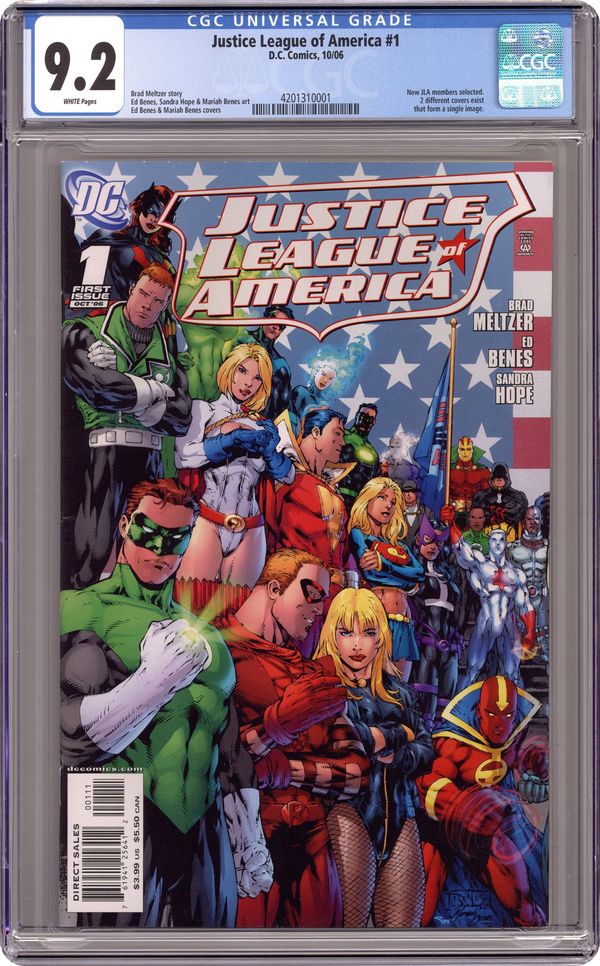 Written by Brad Meltzer Art by Ed Benes & Sandra Hope. Cover by Ed Benes. It begins here - a bold new era for the World's Greatest Heroes by New York Times best-selling author Brad Meltzer and superstar artist Ed Benes! It's Superman, Batman, Wonder Woman...and the true roster of members who will become the new Justice League of America. Join us as we head into 'The Tornado's Path.' Cover price $3.99. Grade: CGC 9.2 explanation of grade Condition: Used (collectible)