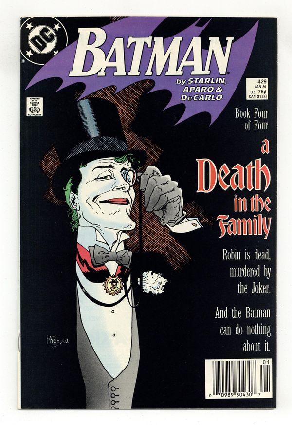 Ended Jun 16 2023 Winning Bid $21 First printing. Direct Edition. Cover art by Mike Mignola. "A Death in the Family" part 4 of 4, script by Jim Starlin, pencils by Jim Aparo, inks by Mike DeCarlo; Batman and Superman talk to CIA agent Ralph Bundy about the Joker's diplomatic status; The agent tries to get Batman to leave the Joker alone; Batman goes to the Joker's hotel room; The Joker confirms that he killed Jason; The Joker pulls a gun, but Batman is already gone; At the UN the Joker tries to poison the audience; Fortunately, Superman sucks up all the poison and flies out of the room to release it; The Joker activates bombs; Batman pursues him. NOTE: Most issues from 397-432 were reprinted in 1989 and sold in multipacks. These 2nd and 3rd prints have back cover ads dated 1989. 36 Pages, Full Color. Cover price $0.75. Grade: VF+ 8.5 explanation of grade Condition: Used (collectible)