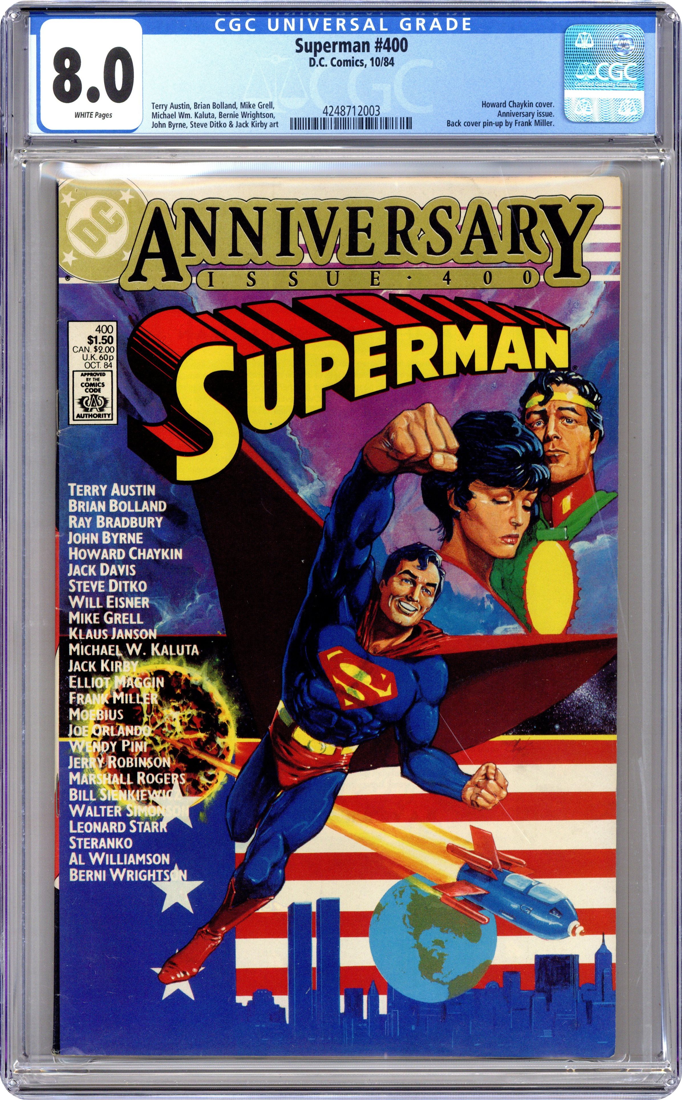 Giant-Sized 400th Anniversary issue! Introduction by Ray Bradbury. How do people look at Superman? How will we see him in the future, as historians and scholars evaluate this figure who so dominated the 20th century? When he is no longer with us...who will we think he was? Come into the future with us to find out and explore..."The Living Legends of Superman." Script by Elliot Maggin. Art by Joe Orlando (4 pages), Al Williamson (8 pages), Frank Miller (4 pages), Marshall Rogers & Terry Austin (7 pages), Wendy Pini (3 pages), Michael W. Kaluta & Kelly Alder (6 pages), Klaus Janson (10 pages), Jim Steranko (10 pages, and Steranko also handles the script, letters & colors for his sequence). Pin-ups by: Brian Bolland, Jack Kirby & Terry Austin, John Byrne, Jack Davis, Leonard Starr (Superman flying with Annie and Sandy), Walt Simonson, Bernie Wrightson, Will Eisner (Superman and the Spirit), Steve Ditko, Mike Grell, Moebius, Bill Sienkiewicz, Jerry Robinson (Batman, Robin, Joker, Penguin appear in pin-up). Cover by Howard Chaykin. Back cover by Frank Miller. 68 Pages, Full Color. Cover price $1.50. Grade: CGC 8.0 explanation of grade Condition: Used (collectible)