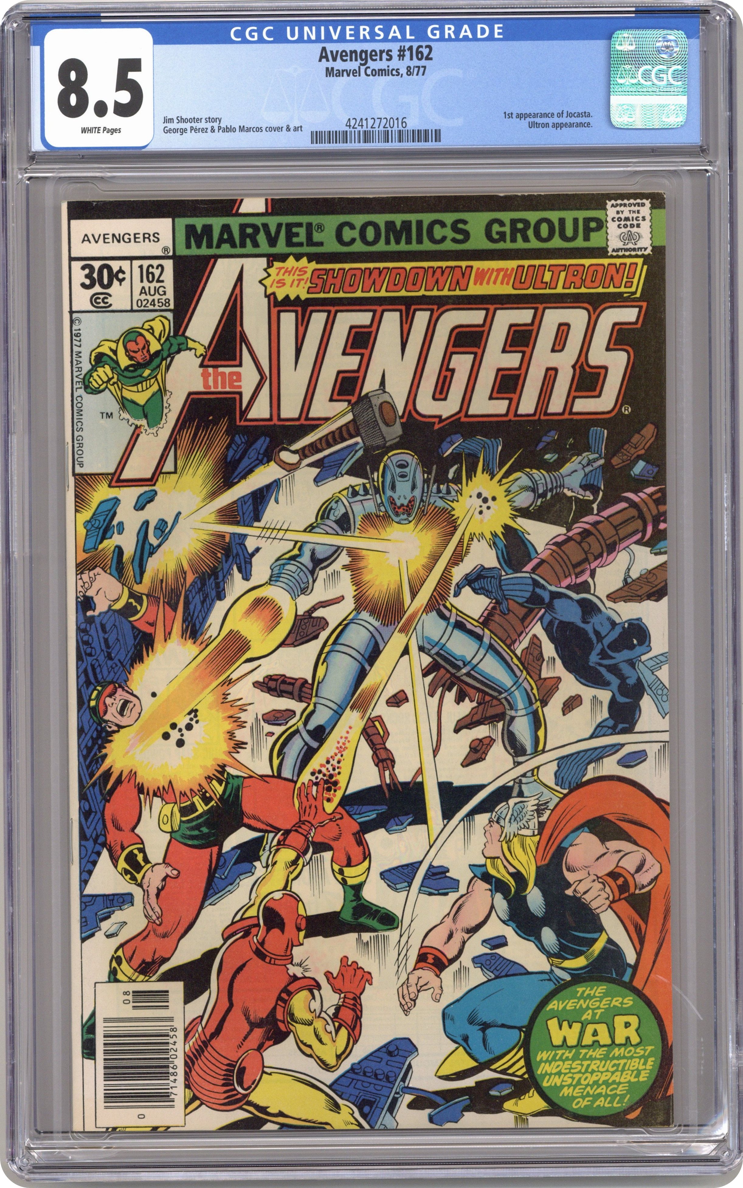 Ended Jun 30 2023 Winning Bid $46 "The Bride of Ultron!" Part 2 of 2. Script by Jim Shooter. Pencils by George Perez. Inks by Pablo Marcos. Cover by George Perez and Pablo Marcos. After defeating the Avengers last issue, Ultron stands triumphant! And now the adamantium monster has a diabolic plan to create a female companion for himself! It's very simple...transfer the life force of Janet Pym into the empty metalloid body of Jocasta! But the Avengers won't go down without a fight! Once the Black Panther, Iron Man, Thor, and Wonder Man locate Ultron inside an abandoned research center on Long Island, the blockbuster battle begins! Can Earth Mightiest Heroes stop the sinister scheme of their long-time foe? Or will the Wasp tragically become the unwilling bride of Ultron? An excellent two-part story! First appearance of Jocasta. Cameo appearances by Hawkeye and the Two-Gun Kid. (Notes: Ultron returns in Avengers 171. A 35-cent cover price variant exists for this issue.) 36 pgs. Cover price $0.30. Grade: CGC 8.5 explanation of grade Condition: Used (collectible)