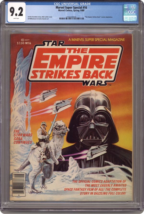 Star Wars: The Empire Strikes Back. The official comic book adaptation of the George Lucas classic. Written by Archie Goodwin, with art by Al Williamson and Carlos Garzon. Lettered by Rick Veitch! Story later reprinted in Marvels Star Wars #39-44. Full color; 96 pages. Painted cover by Bob Larkin. Cover price $2.00. Grade: CGC 9.2 explanation of grade Condition: Used (collectible)