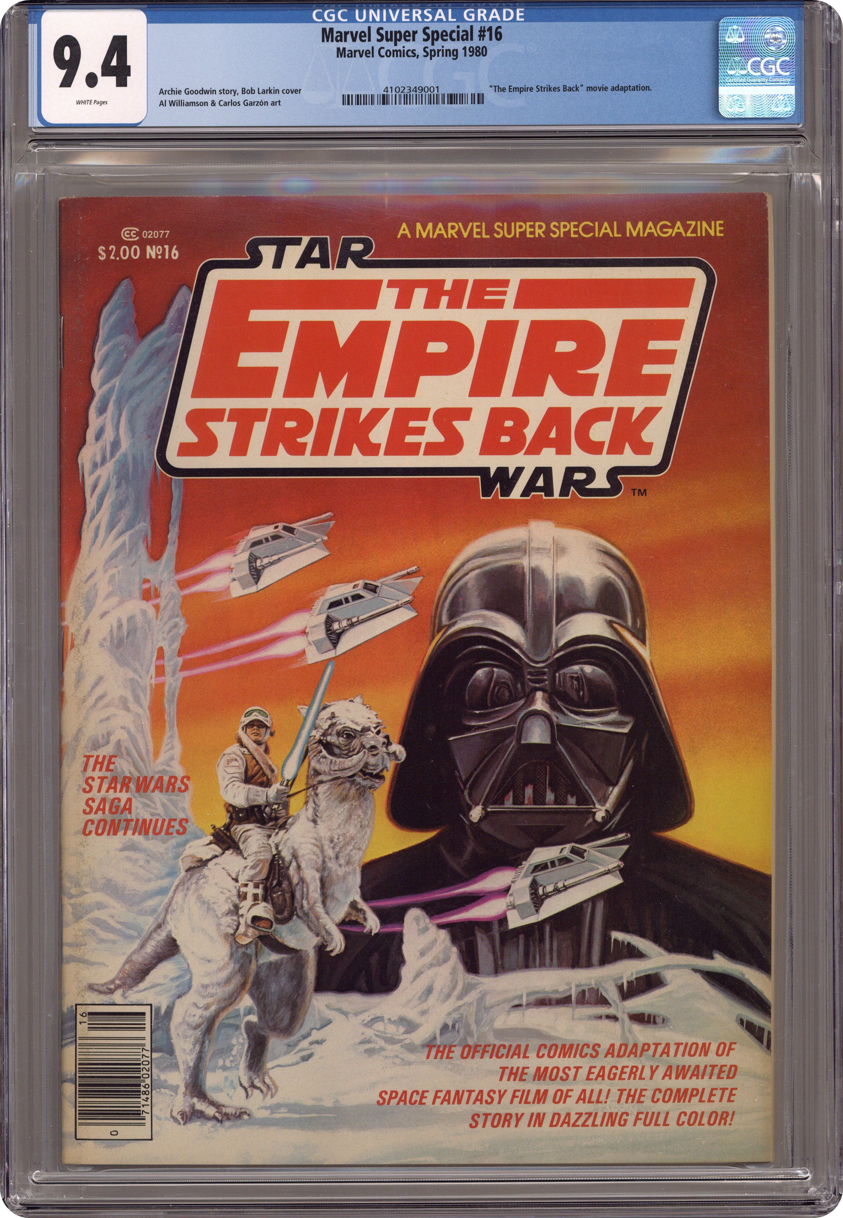 Starts Jan 3 Star Wars: The Empire Strikes Back. The official comic book adaptation of the George Lucas classic. Written by Archie Goodwin, with art by Al Williamson and Carlos Garzon. Lettered by Rick Veitch! Story later reprinted in Marvels Star Wars #39-44. Full color; 96 pages. Painted cover by Bob Larkin. Cover price $2.00. Grade: CGC 9.4 explanation of grade Condition: Used (collectible)