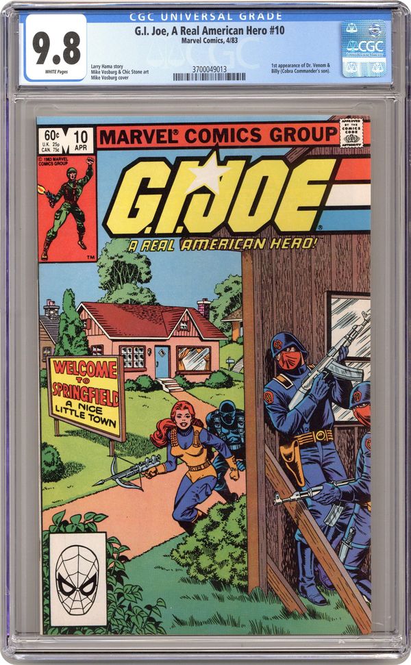 First printing. Direct Edition. Written by Larry Hama. Art by Mike Vosburg and Chic Stone. "A Nice Little Town Like Ours..!" The Joes have their work cut out for them as they investigate an entire town that is a front for a Cobra operation. Featuring the 1st flashbacks of to Snake-eyes' mysterious past and ninja training. 32 pages, FC. NOTE: 1st appearance of Dr. Venom. Cover price $0.60. Grade: CGC 9.8 explanation of grade Condition: Used (collectible)