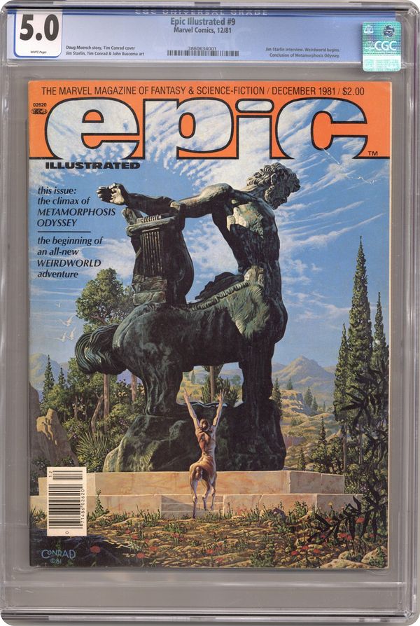 Ended Sep 16 2024 Winning Bid $10 Epic Illustrated was touted as a new experience in adult fantasy and science fiction adventure. Published by Marvel Comics, this magazine was aimed at a more mature audience. Issue #9 includes: Metamorphosis Odyssey: Doomsday & Aftermath by Jim Starlin, The Last Centaur by Tim Conrad, Children of the Stars by Charles Vess, Weirdworld: The Dragonmaster of Klarn by Doug Moench, John Buscema, Marie Severin, and Steven Oliff, Tales of Torment by David Kasakove, Match and Set by Lee Marrs, and Isolation and Illusion by P. Craig Russell. Also includes Jim Starlin interview by Archie Goodwin and a letter by Catherine Yronwode. December, 1981. Cover price $2.00. Grade: CGC 5.0 explanation of grade Condition: Used (collectible)