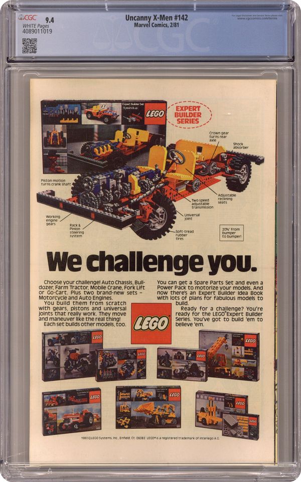 Direct Edition. Days of Future Past: Part 2 of 2. "Mind Out of Time!" Story by Chris Claremont and John Byrne. Art by John Byrne and Terry Austin. Cover by Terry Austin. In order to prevent a dystopian future where all mutants and super-heroes are hunted and killed by the robotic Sentinels, the X-Men must prevent the new Brotherhood of Evil Mutants from assassinating Senator Kelly. Featuring one of the most shocking death scenes in the comic book history. NOTE: Uncanny X-Men #123 and #142 are rare commodities in the realm of comics as they are two of the very few covers where inker extraordinaire Terry Austin actually does the pencils as well. - Odinson Lone Star Comics Archivist. 36 pgs. Cover price $0.50. Grade: CGC 9.4 explanation of grade Condition: Used (collectible)