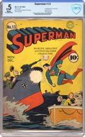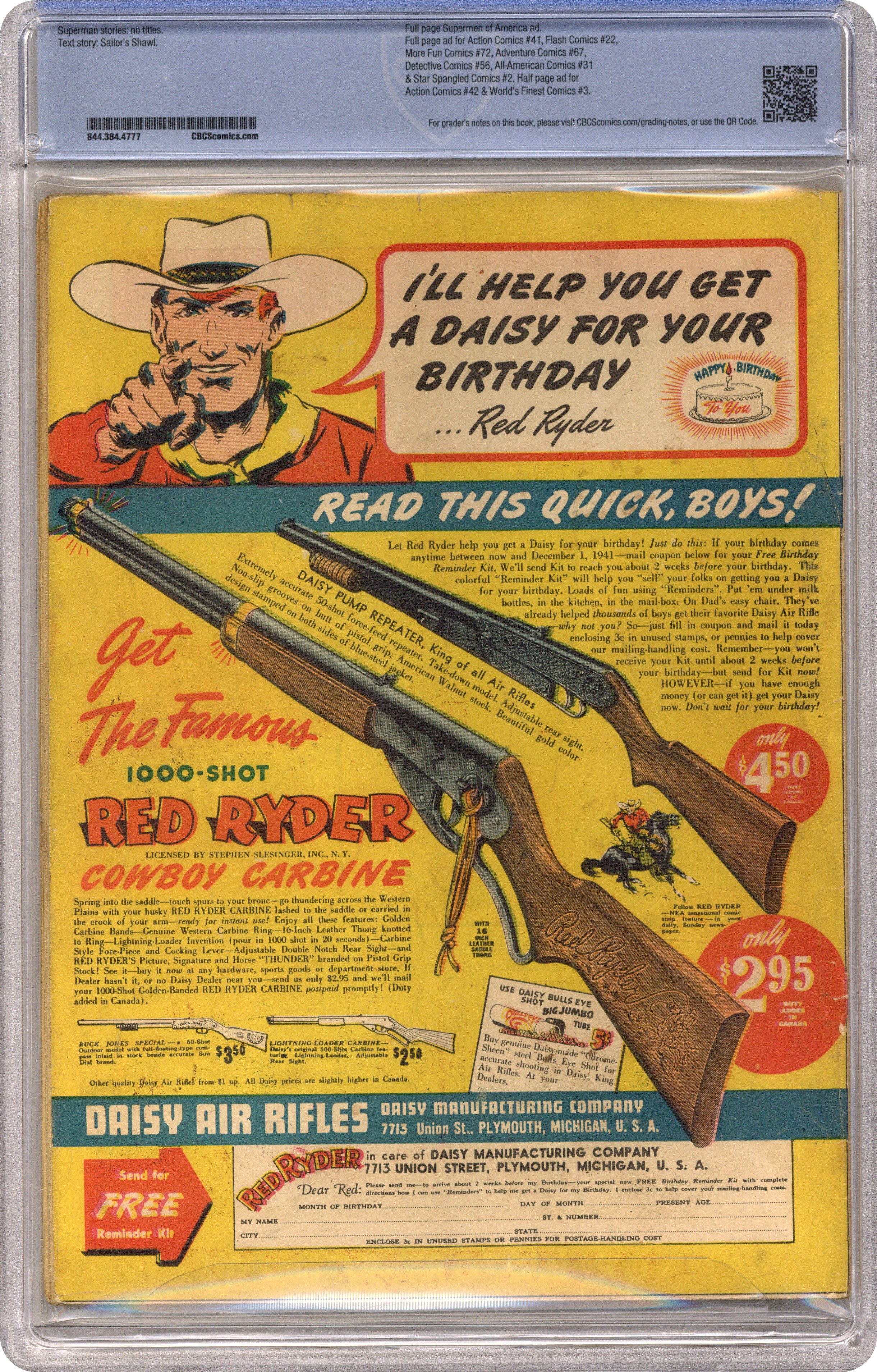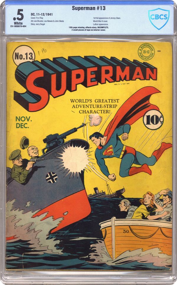 Ended Oct 15 2023 Winning Bid $405 Cover art by Fred Ray. Untitled Superman story, script by Jerry Siegel, pencils by Joe Shuster (layouts) and Leo Nowak (finishes) [as Shuster], inks by Leo Nowak [as Shuster]; Superman must battle Lex Luthor who is disguised as The Light, a criminal who kidnaps prominent men from many different fields, hypnotizes them with colored lights, and makes them do his bidding. Superman versus The Archer, script by Jerry Siegel, art by Leo Nowak [ghosting for Joe Shuster]; A new villain hits the front pages of Metropolis' newspapers, a villain who prefers hunting human beings for profit rather than animals. Sailor's Shawl text story, script by Gardner F. Fox, art by Cliff Young. Jerry the Jitterbug two-pager by Henry Boltinoff. 68 Pages, Full Color. Jimmy Olsen appears in this issue as a blonde, last name not yet used. Cover price $0.10. Grade: CBCS 0.5 explanation of grade Condition: Used (collectible)
