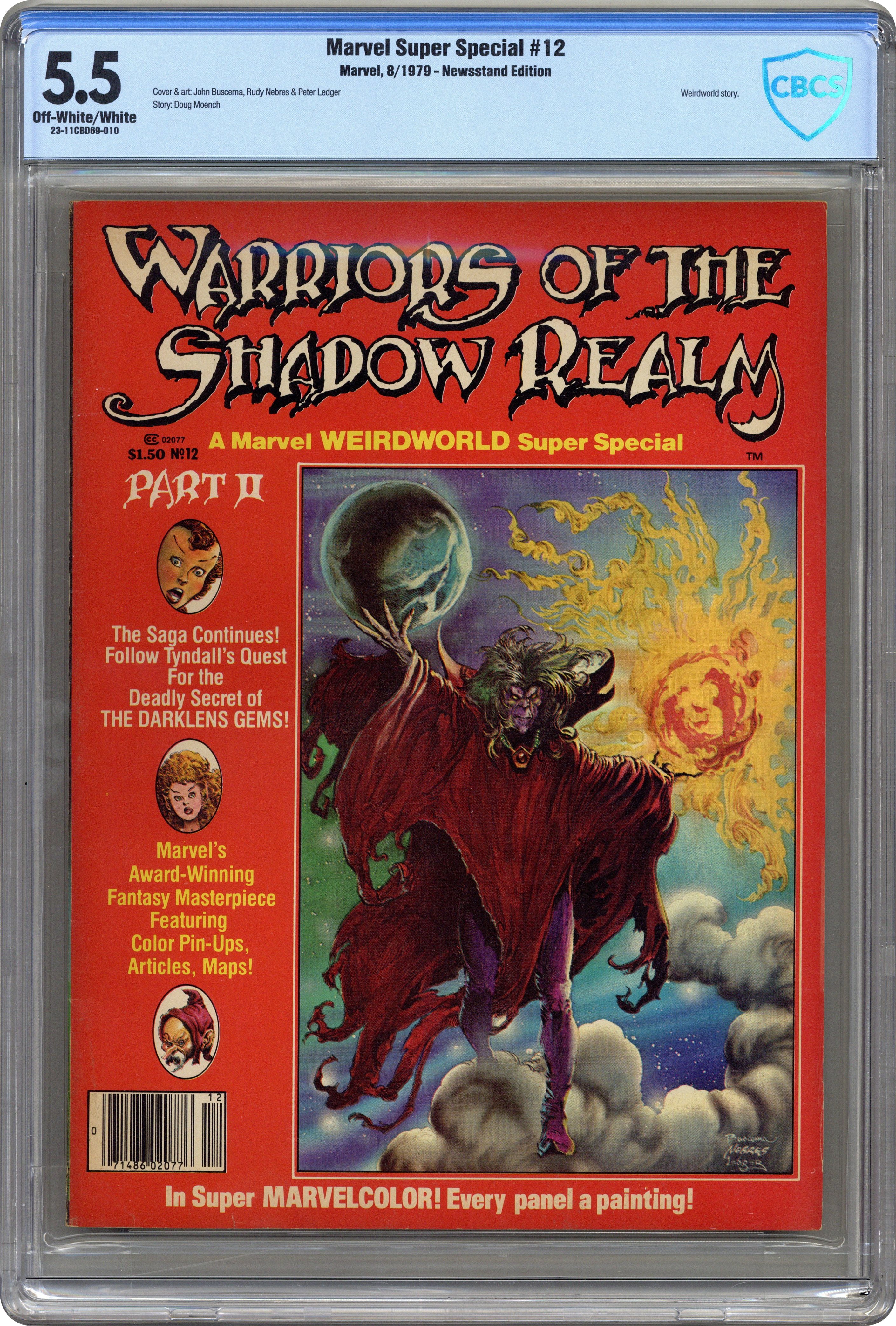 Ended Feb 13 2024 Winning Bid $11 Warriors of the Shadow Realm. Part II of a Weirdworld epic written by Doug Moench, with art by John Buscema, Rudy Nebres and Peter Ledger. Tyndall, Velanna and Mud-Butt encounter a lost race of elves and battle a fallen god. Also includes a history of fantasy illustration by editor Richard Marschall. Full color. Painted cover by Buscema. 52 pages. Cover price $1.50. Grade: CBCS 5.5 explanation of grade Condition: Used (collectible)