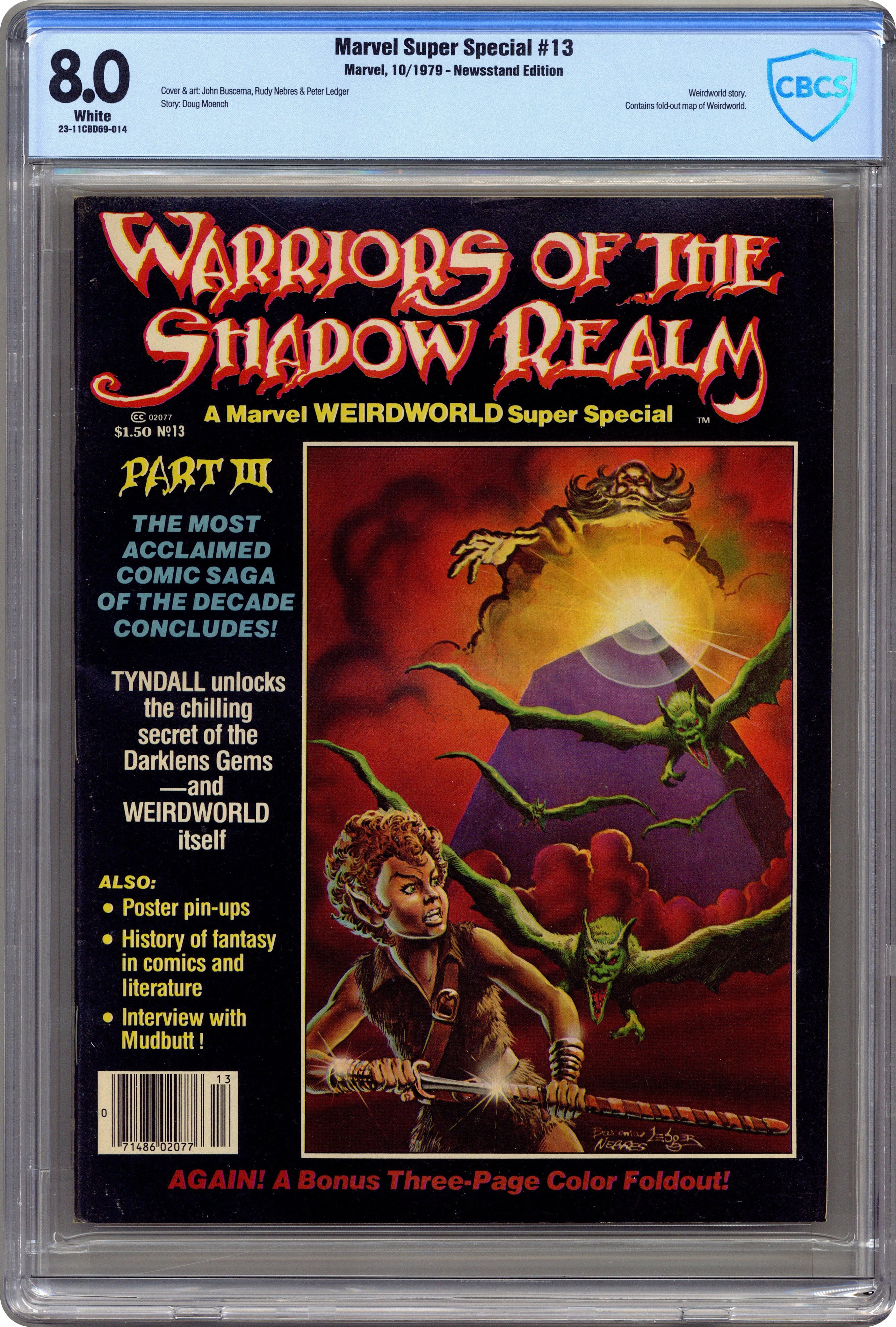 Ended Jun 19 2024 Winning Bid $18 Warriors of the Shadow Realm. Part III of a Weirdworld epic written by Doug Moench, with art by John Buscema, Rudy Nebres and Peter Ledger. Tyndall, Velanna and Mud-Butt encounter a lost race of elves and battle a fallen god. Includes bonus art and background info on Weirdworld. Full color. Painted cover by Buscema. 60 pages. Cover price $1.50. Grade: CBCS 8.0 explanation of grade Condition: Used (collectible)