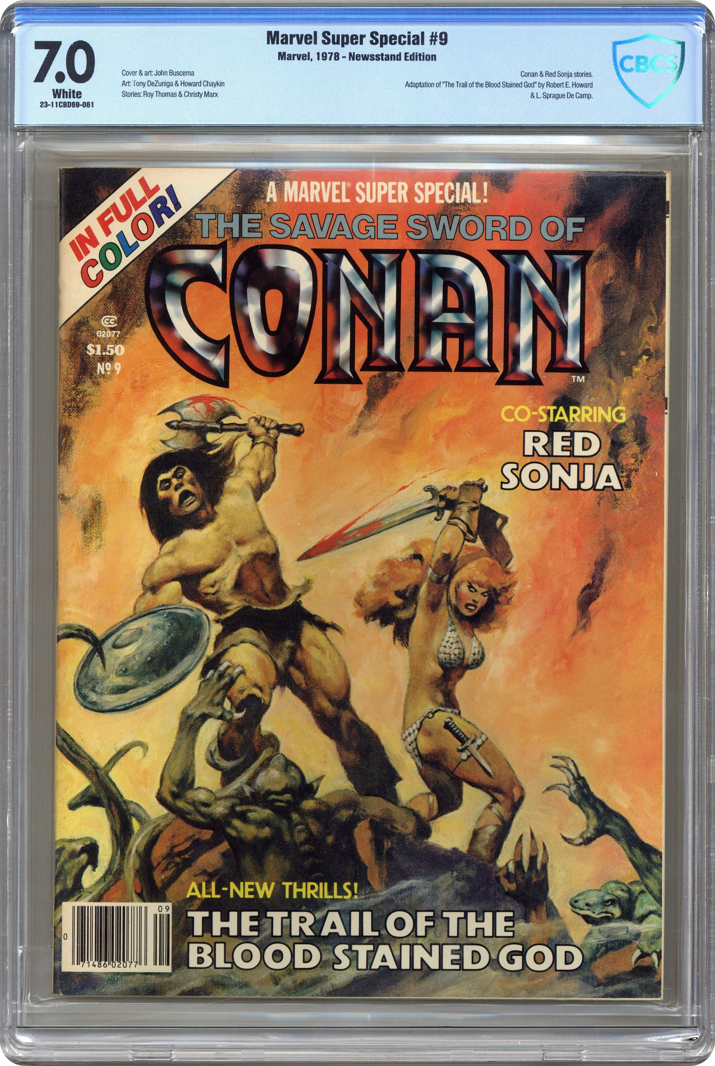 Ended Jan 30 2024 Winning Bid $29 The Savage Sword of Conan. Conan in Robert E. Howards Trail of the Bloodstained God, written by Roy Thomas, with art by John Buscema and Tony DeZuniga. Red Sonja in Day of the Red Judgment, written by Roy Thomas, with art by Howard Chaykin. Full color. Painted cover by Buscema. Cover price $1.50. Grade: CBCS 7.0 explanation of grade Condition: Used (collectible)