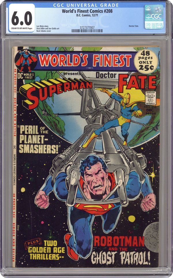 Ended Sep 12 2023 Winning Bid $18 Cover art by Neal Adams. Peril of the Planet-Smashers! starring Superman, Dr Fate, and Zatanna, script by Len Wein, pencils by Dick Dillin, inks by Joe Giella. The Inside Story of Robotman!, script by Joe Samachson, art by Jimmy Thompson; the origin of Robotman (from Detective Comics 138 in 1948). The 'Spectacular' Crimes starring The Ghost Patrol, script by John Broome, pencils by Carmine Infantino, inks by Bob Oksner (from Flash Comics 96 in 1948). 52 Pages, Full Color. Cover price $0.25. Grade: CGC 6.0 explanation of grade Condition: Used (collectible)