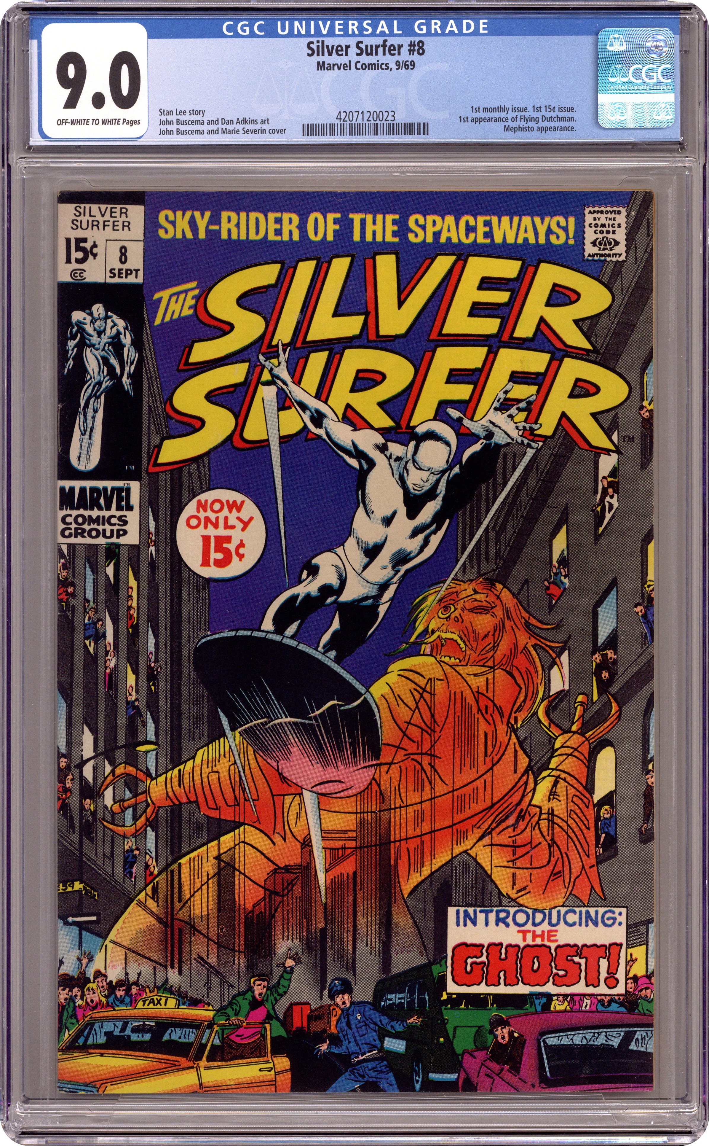 "Now Strikes the Ghost!" Part 1 of 2. Written by Stan Lee. Art by John Buscema and Dan Adkins. Mephisto, the very embodiment of evil, sends a powerful emissary, The Flying Dutchman, to destroy his hated enemy, the Silver Surfer. Cover price $0.15. Grade: CGC 9.0 explanation of grade Condition: Used (collectible)