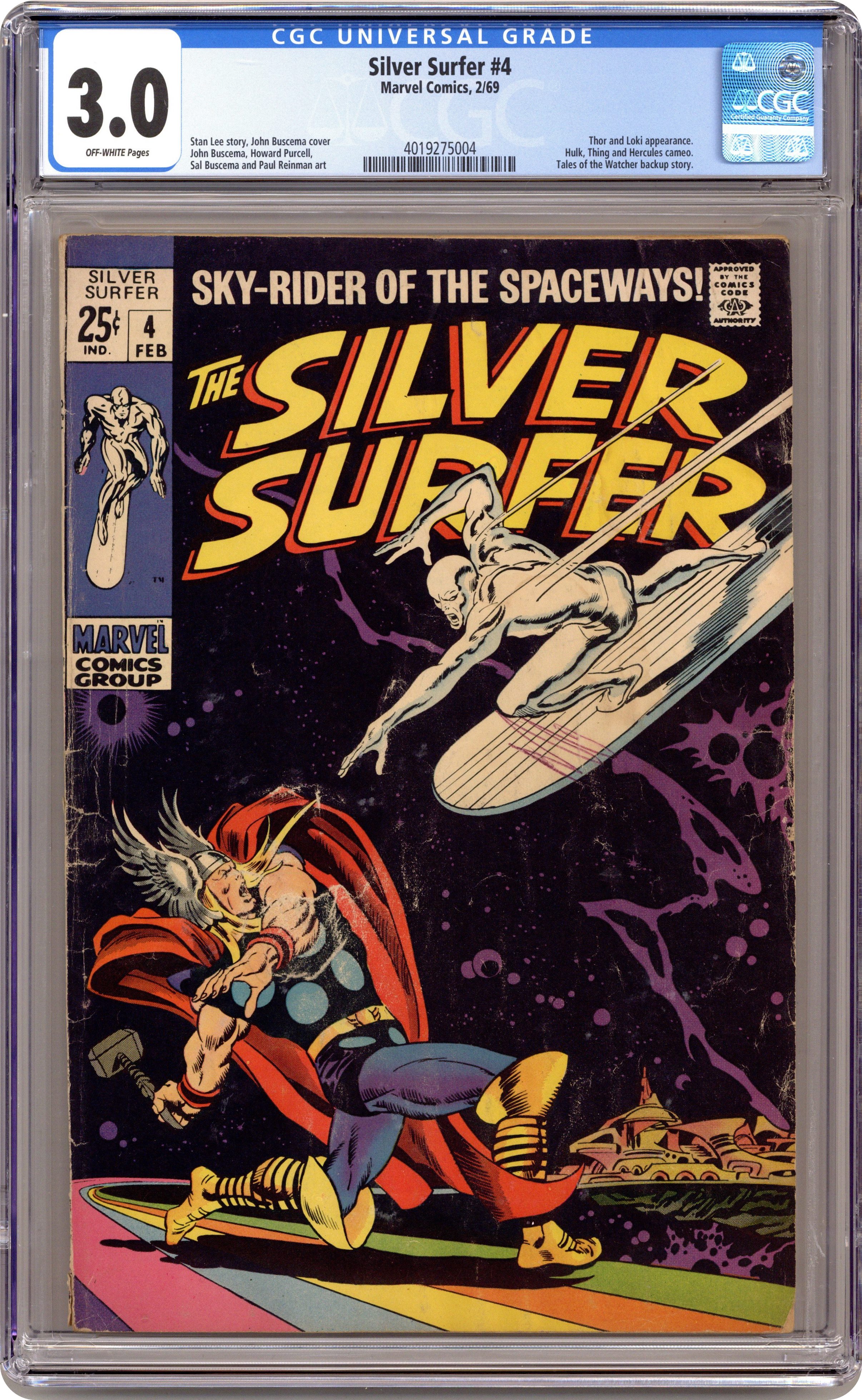 Ended Apr 18 2024 Winning Bid $355 "The Good, the Bad, and the Uncanny!" Guest-starring Thor. Written by Stan Lee. Art by John Buscema and Sal Buscema. Cover by John Buscema. When the Silver Surfer ventures to fabled Asgard, home of the Norse Gods, a misunderstanding sets the Sentinel of the Spaceways against the mighty God of Thunder. It's the Power Cosmic vs. godly might. It's Thor vs. the Silver Surfer in a battle that will truly shake the heavens! Includes the Watcher back-up "The Terror of Tim Boo Ba." Story by Stan Lee. Art by Howard Purcell and Paul Reinman. Low distribution. 68-page giant. Cover price $0.25. Grade: CGC 3.0 explanation of grade Condition: Used (collectible)