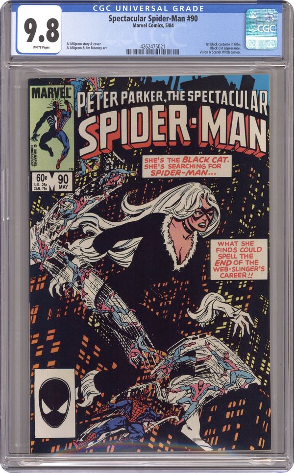 Ended Oct 29 2023 Winning Bid $291 Direct Edition. "Where, Oh Where Has My Spider-Man Gone?" Script and Pencils by Al Milgrom. Inks by Jim Mooney. Cover by Al Milgrom. The Spectacular Spider-Man is missing! Where is he? The Black Cat is looking everywhere! She checks with everyone including Mrs. Muggins, Captain DeWolff, J. Jonah Jameson, Aunt May, and the Avengers! When the web-slinger finally reappears on the final page, he's wearing his new black costume! Cameo appearances by the Vision and the Scarlet Witch. (Notes: Spider-Man's new costume debuted this month in Amazing Spider-Man 252, Marvel Team-Up 141, and this issue. The letters page includes a statement of ownership: average print run 351,448; average paid circulation 172,290.) 32 pages Cover price $0.60. Grade: CGC 9.8 explanation of grade Condition: Used (collectible)