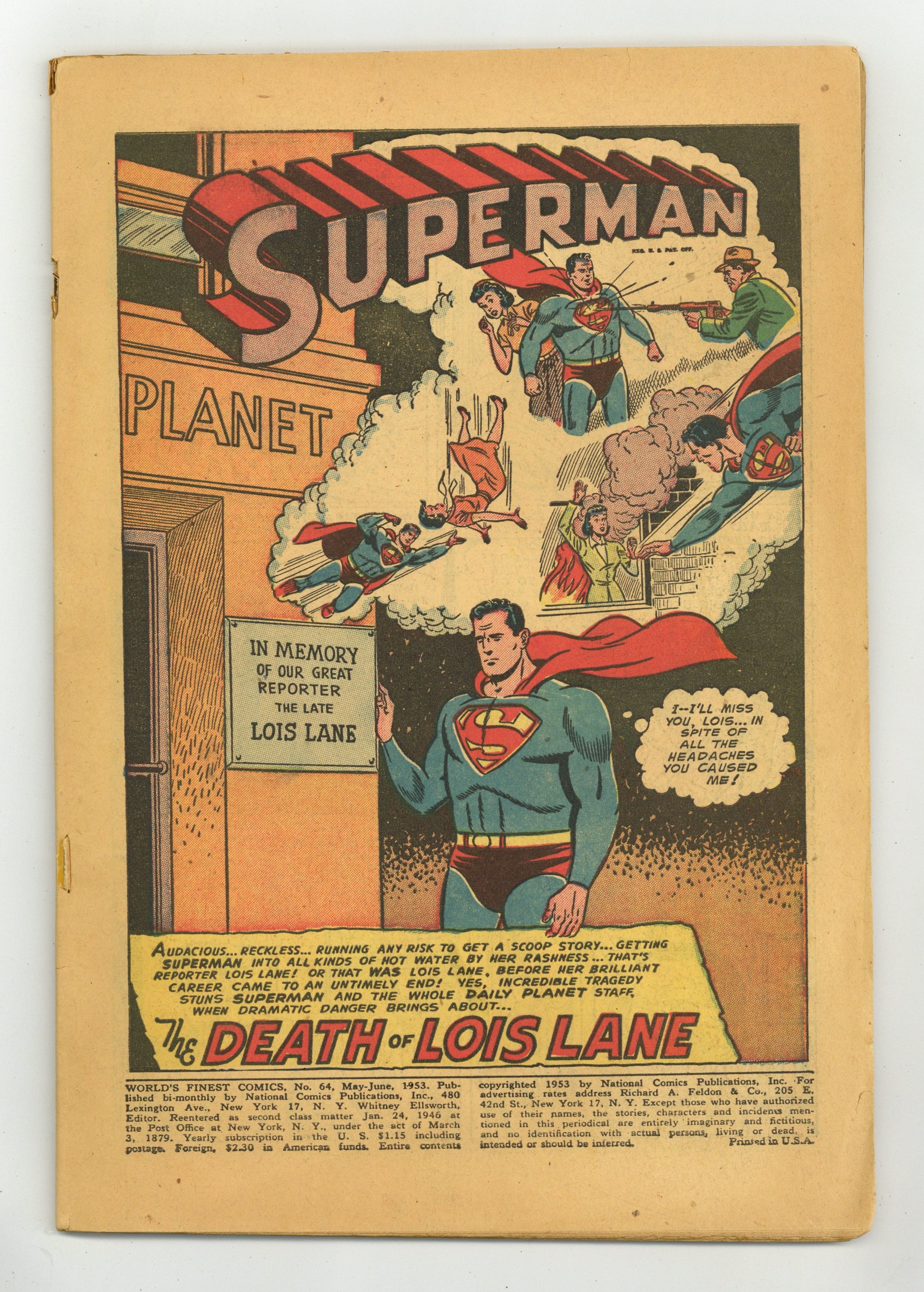 Cover art by Winslow Mortimer. The Death of Lois Lane starring Superman, script by William Woolfolk, pencils by Al Plastino. The One-Armed Archer starring Green Arrow, script by Dave Wood, art by George Papp. Spy Train starring King Faraday, script by Robert Kanigher, pencils by Carmine Infantino, inks by Sy Barry; King Faraday, on the trail of a killer, rides the Orient Express, where he meets a movie starlet and a camera-happy tourist. The Wyoming Kid's Pal, script by Gardner Fox, pencils by Howard Sherman. Bruce Wayne... Amateur Detective starring Batman, pencils by Dick Sprang, inks by Charles Paris. 68 Pages, Full Color. Cover price $0.15. Grade: Coverless explanation of grade Condition: Used (collectible)