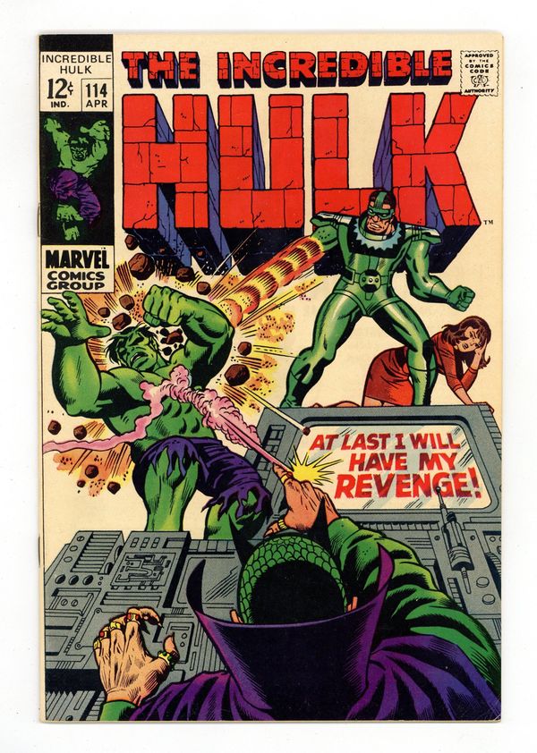 Cover pencils by Herb Trimpe, inks by Dan Adkins. At Last I Will Have My Revenge!, script by Stan Lee, pencils by Herb Trimpe, inks by Dan Adkins; Itching for revenge after his recent defeat, the Mandarin figures that if he combines his might with that of the Sandman, they can finally succeed in beating the Hulk; They can't; After the battle, the military busts in and captures the Hulk once again. 36 pgs. $0.12. Cover price $0.12. Grade: FN/VF 7.0 explanation of grade Condition: Used (collectible)