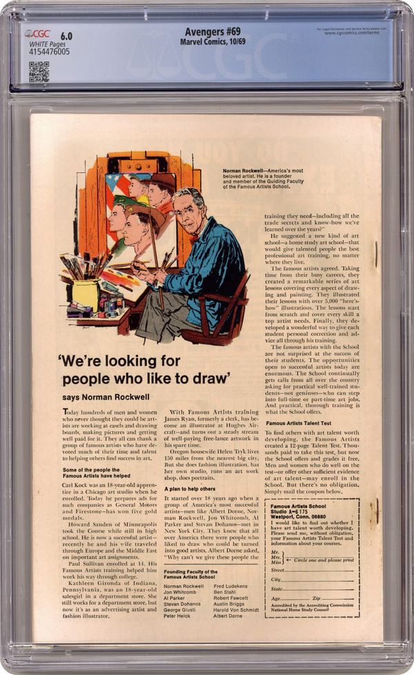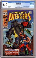"Let the Game Begin!" Part 1 of 3. Script by Roy Thomas. Pencils by Sal Buscema. Inks by Sam Grainger. Cover by Sal Buscema and Sam Grainger. Fate of Tony Stark: Part 3 of 4 - After the events of Iron Man 18, Earth's Mightiest Heroes rush to the hospital to check on the condition of their benefactor, Tony Stark! While waiting in Tony's room, the Wasp notices a small doll lying on the floor. But it's not a small doll; it's a small man…the Growing Man! And in a matter of minutes the alien stimuloid surges to thirty-feet tall and grabs Tony! The Avengers begin pursuing the Growing Man but are suddenly halted and whisked away to another place and time! Wow, who could have done that? Who else…but the Master of Time! Kang the Conqueror has transported the Avengers to the 41st century to fight as his pawns in the game of the galaxies! And the game starts next issue vs. the Squadron Sinister! First appearances of the Grandmaster, Kyle Richmond (cameo), and the Squadron Sinister (cameo). Additional cameo appearances by Ravonna, Doctor Spectrum, Hyperion, Nighthawk (aka Kyle Richmond), and the Whizzer. Avengers Lineup: Black Panther, Captain America, Goliath, Hawkeye, Iron Man, Thor, Vision, Yellowjacket, and the Wasp. (Notes: This is the first appearance of Kyle Richmond who would eventually become a long-time member of the Defenders. The Whizzer is a new villain not to be confused with the golden age Whizzer (aka Bob Frank). Kang and the Growing Man previously appeared in Thor 140. The Avengers last fought Kang in Avengers 23 & 24.) 36 pages. Cover price $0.15. Grade: CGC 6.0 explanation of grade Condition: Used (collectible)